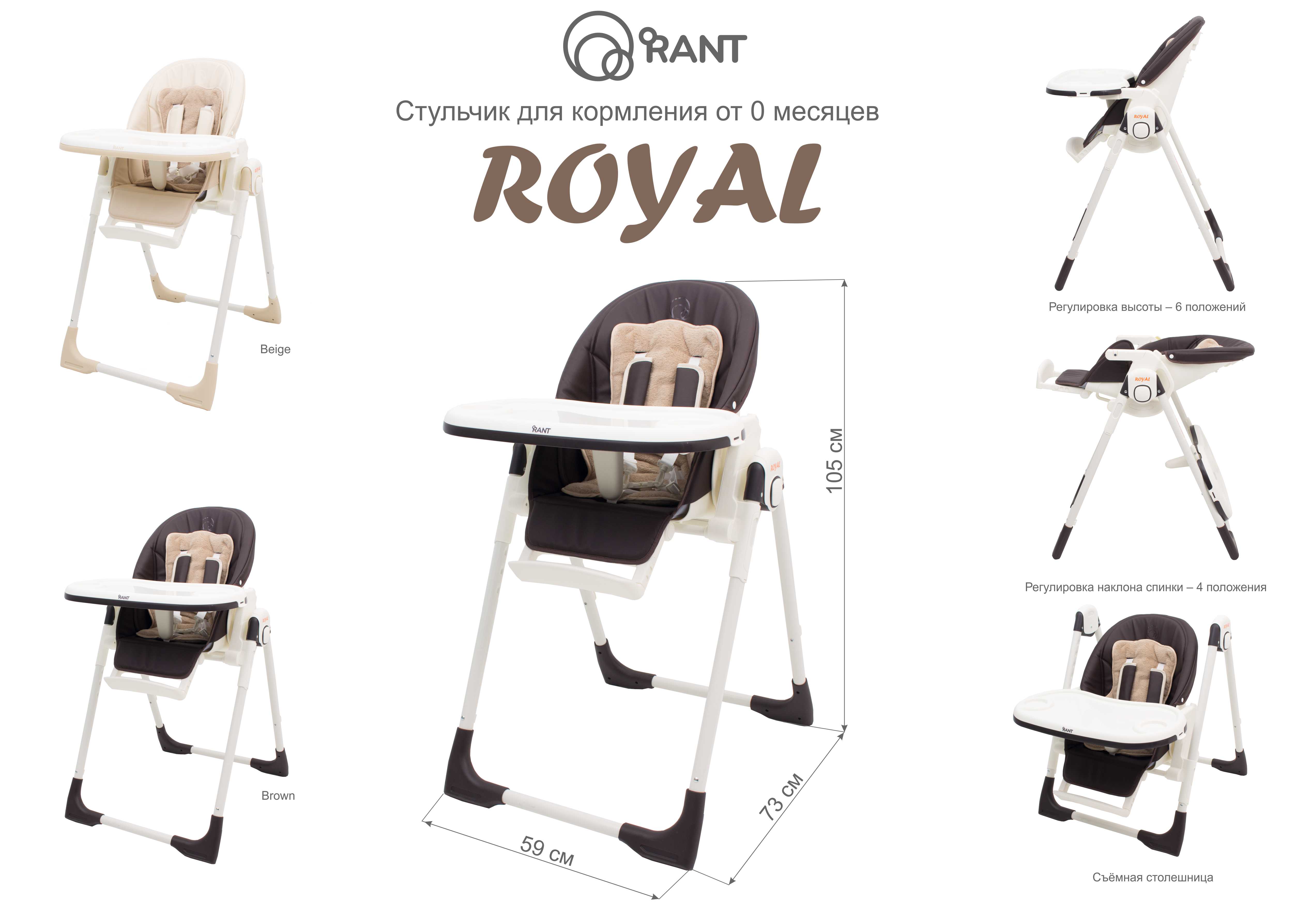 Стульчик для кормления Rant Royal (Рант Роял) - новинка 2019 года. Красивый и функциональный стульчик, рекомендованный для детей от 6 месяцев. Благодаря почти горизонтальному наклону спинки стул можно использовать как шезлонг для детей с рождения. Благодаря большому количеству настроек стул можно регулировать по высоте, наклону спинки и подножки, глубине столика. Обивка стульчика выполнена из качественной эко кожи, за которой легко ухаживать, а при необходимости стирать в стиральной машине при 30 градусах. Для дополнительного комфорта малышей предусмотрен мягкий съемный матрасик из приятной ткани. Стульчик легко перемещать по кухни, и компактно складывается для вертикального хранения.