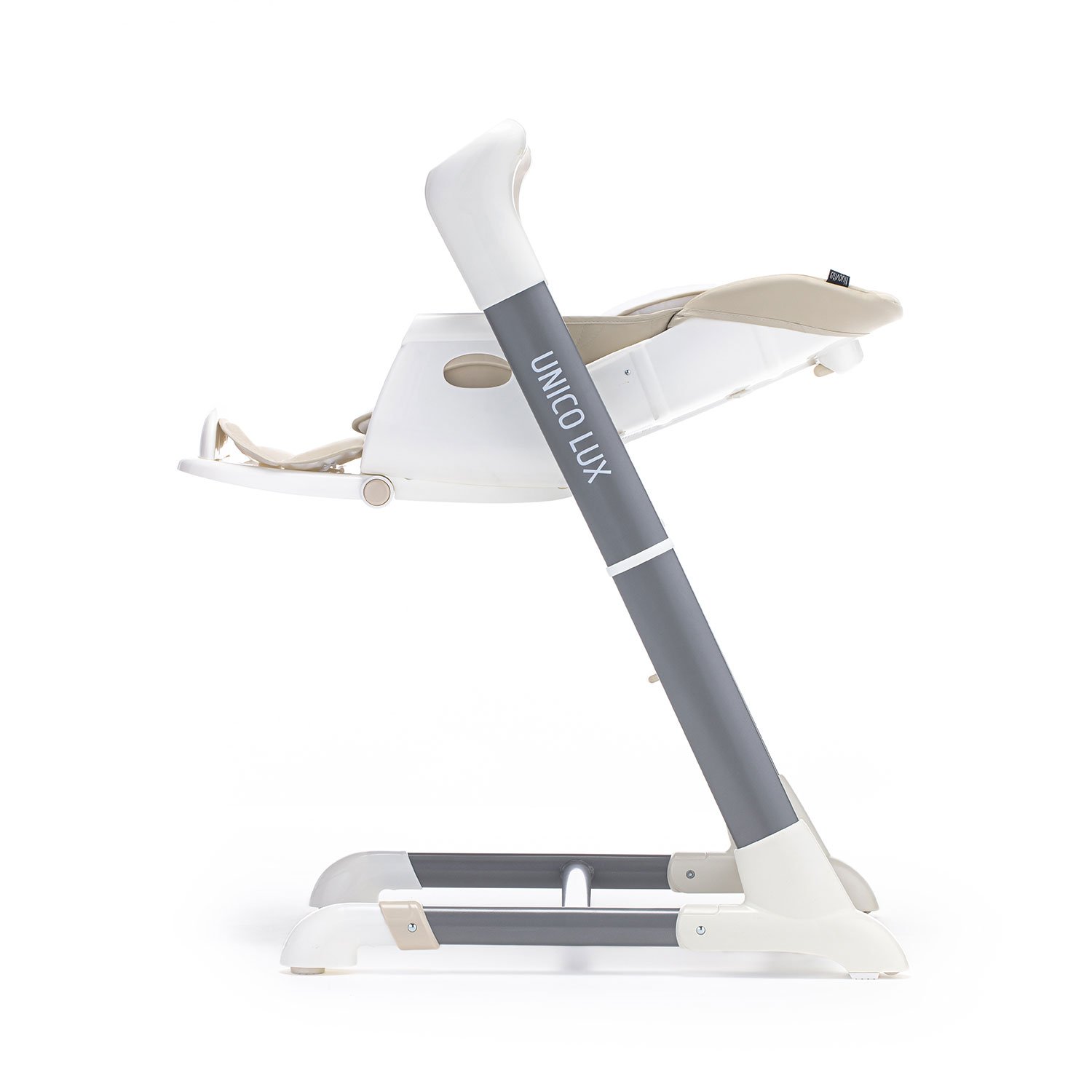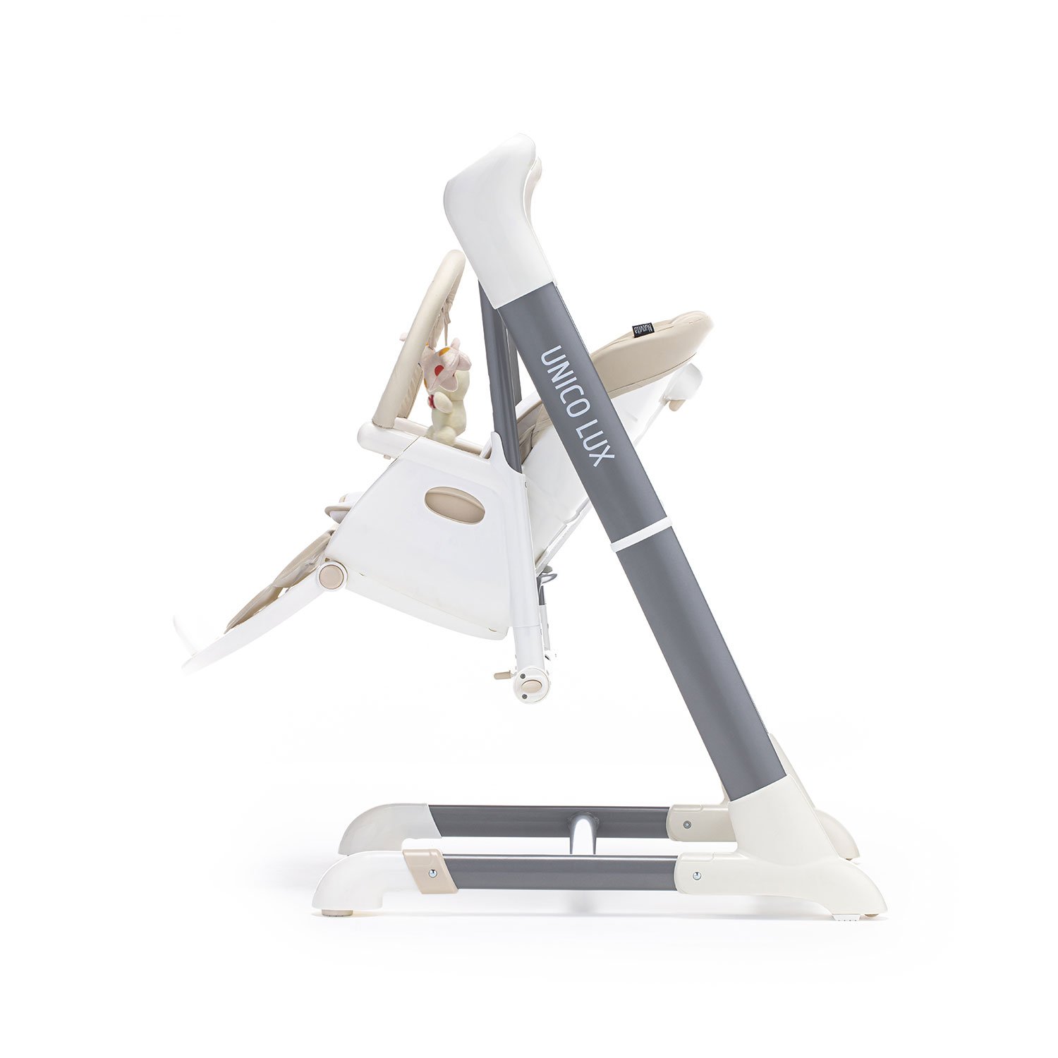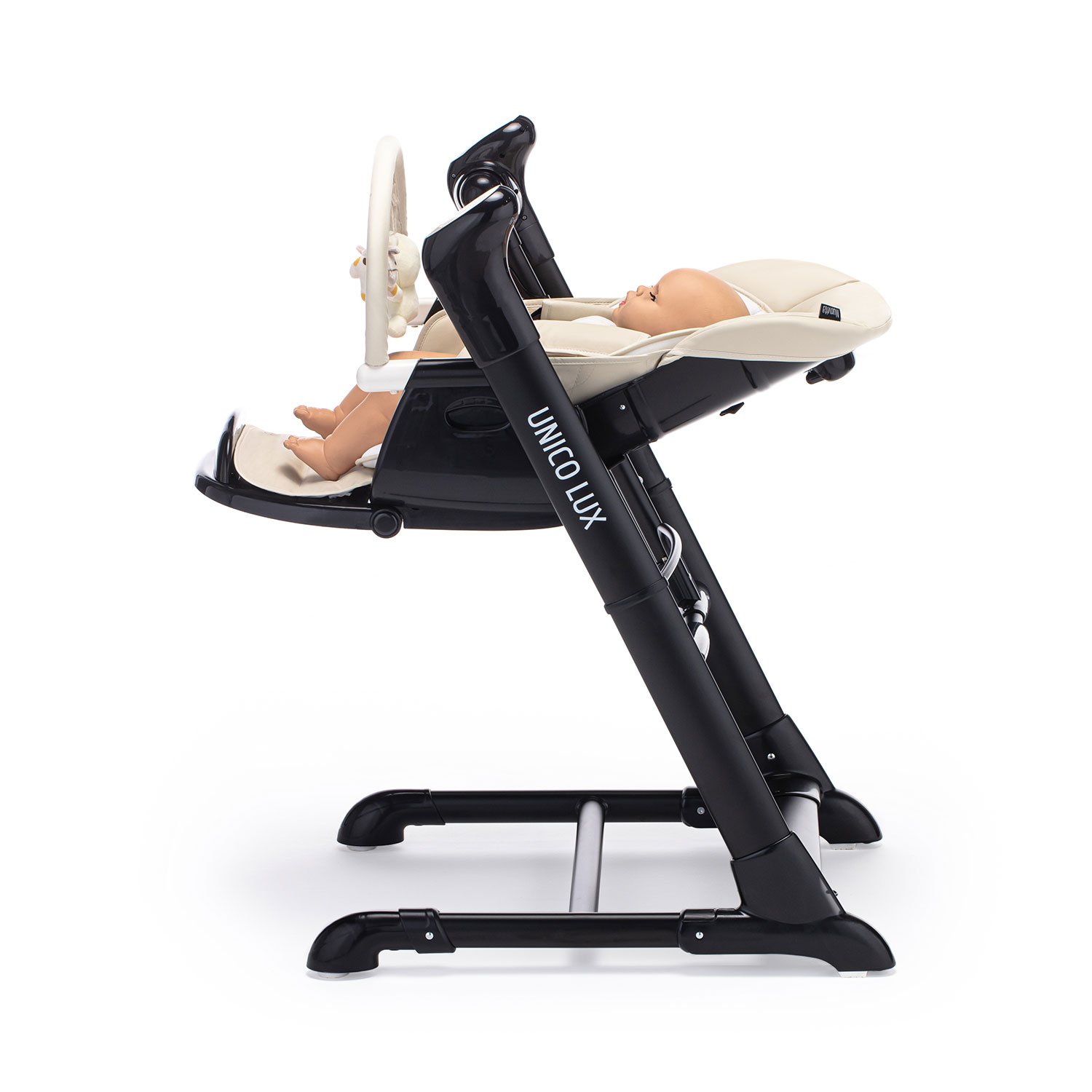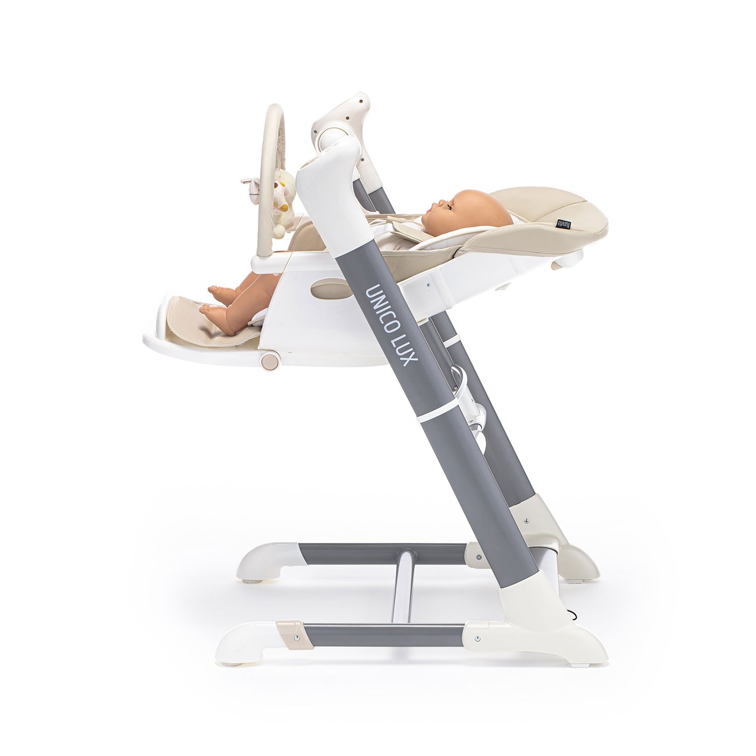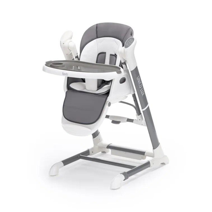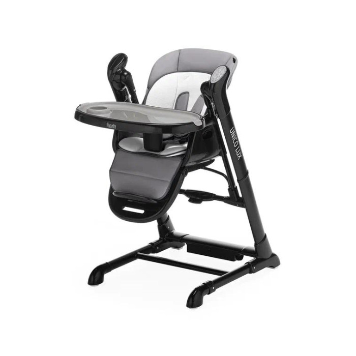 Стул для кормления Nuovita Unico lux (Нуовита Юнико Люкс) - уникальный стул с электронным устройством качания. Детский стул трансформер можно использовать с рождения ребенка до 3-4 лет. Для новорожденного это будет комфортная "колыбель" – шезлонг, в которой малыш может спать или наблюдать за родителями в любой точке квартиры или дома. Они легко перемещаются, позволяя заниматься своими делами и всегда быть рядом с ребенком. В дальнейшем стул превращается в полноценное, удобное и безопасное место для кормления, игр и занятий. Надежные 5-ти точечные ремни надежно и аккуратно зафиксируют малыша в стульчике. Подножка регулируется по высоте и глубине, позволяя удлинить спальное место и позволить ребенку удобно размесить ножки во время кормления. Спинка стула имеет несколько наклонов от полностью сидячего до почти горизонтального положения.