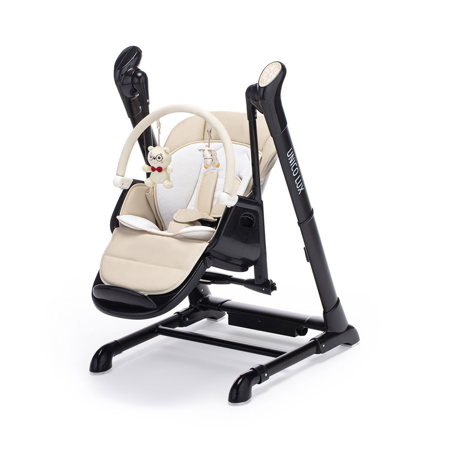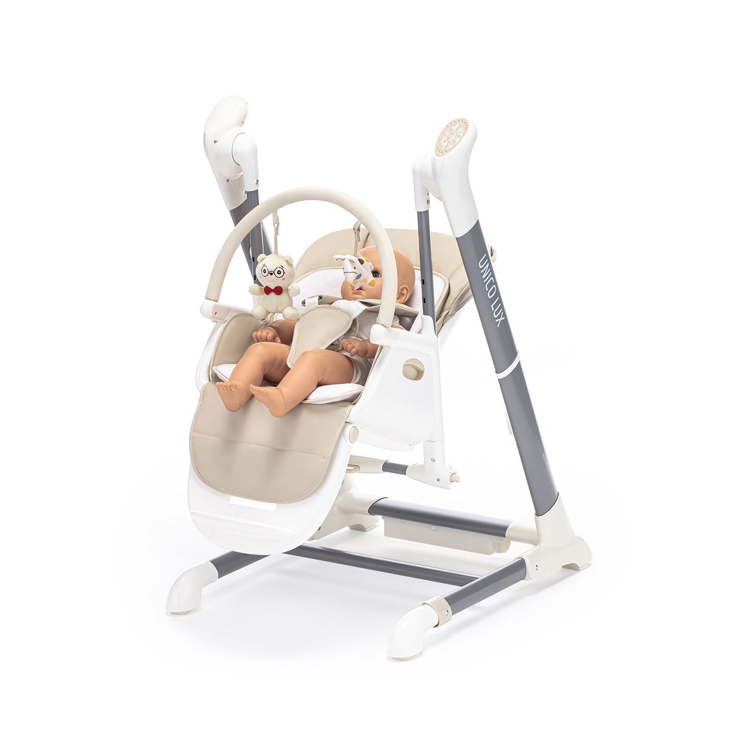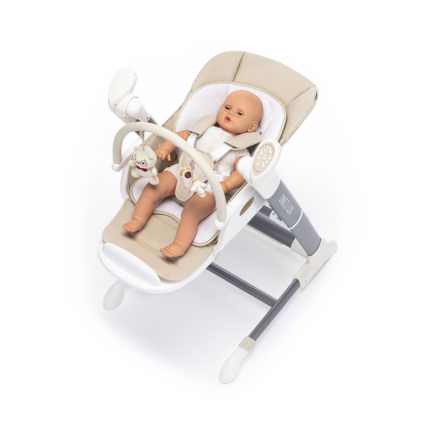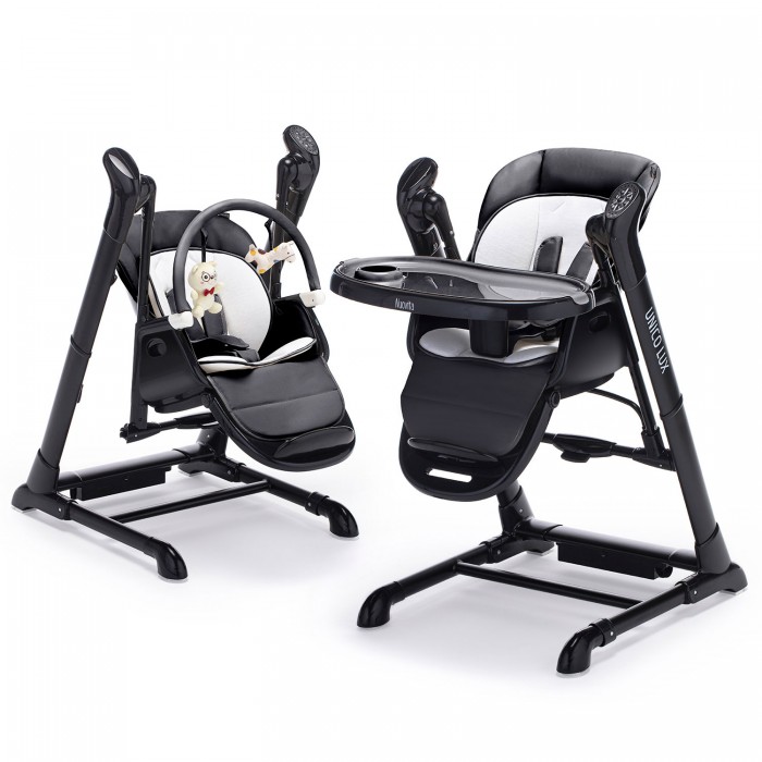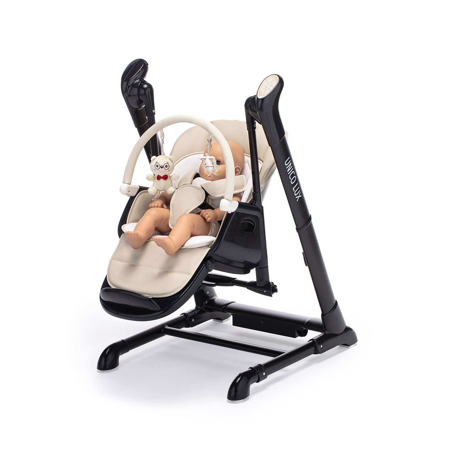 Стул для кормления Nuovita Unico lux (Нуовита Юнико Люкс) - уникальный стул с электронным устройством качания. Детский стул трансформер можно использовать с рождения ребенка до 3-4 лет. Для новорожденного это будет комфортная "колыбель" – шезлонг, в которой малыш может спать или наблюдать за родителями в любой точке квартиры или дома. Они легко перемещаются, позволяя заниматься своими делами и всегда быть рядом с ребенком. В дальнейшем стул превращается в полноценное, удобное и безопасное место для кормления, игр и занятий. Надежные 5-ти точечные ремни надежно и аккуратно зафиксируют малыша в стульчике. Подножка регулируется по высоте и глубине, позволяя удлинить спальное место и позволить ребенку удобно размесить ножки во время кормления. Спинка стула имеет несколько наклонов от полностью сидячего до почти горизонтального положения.