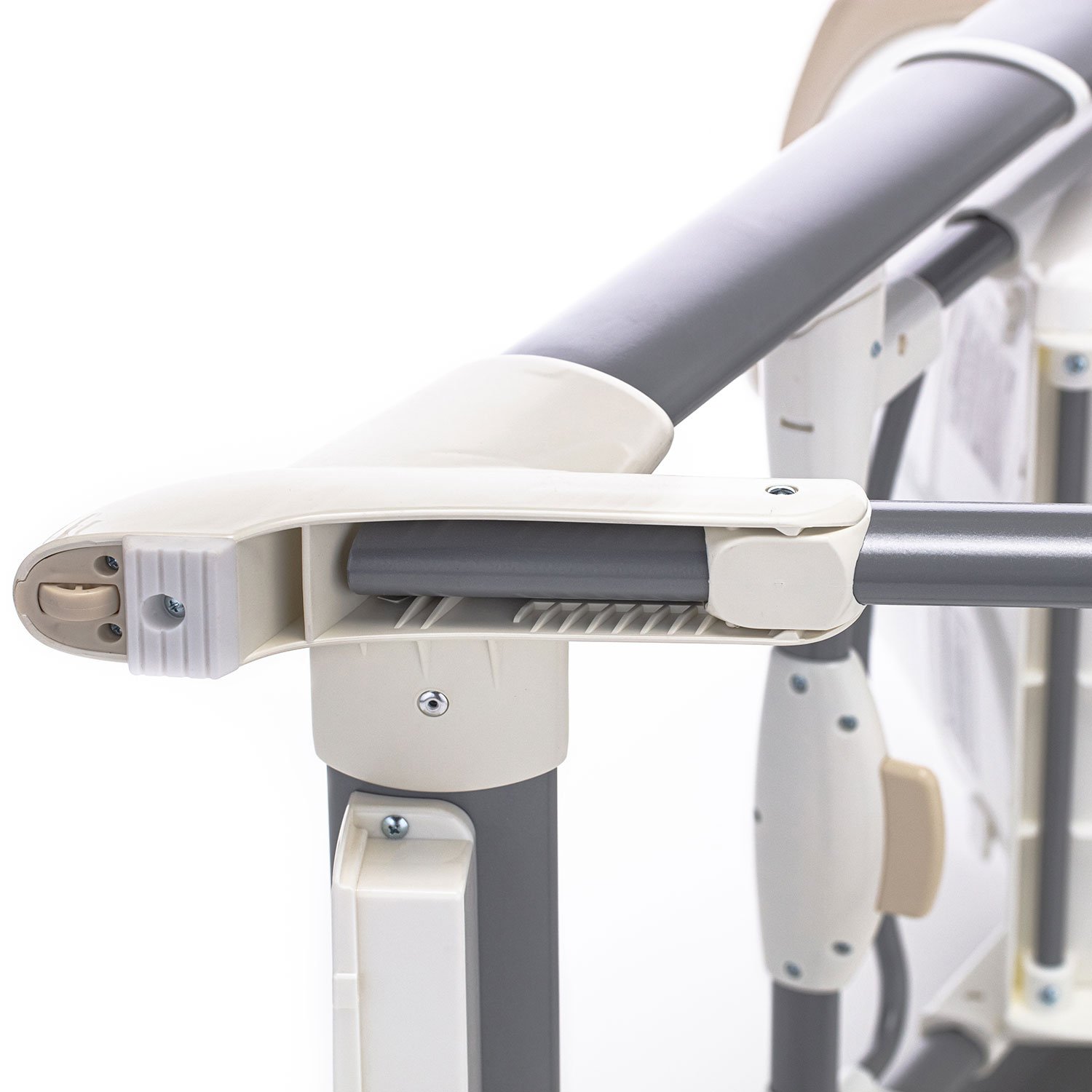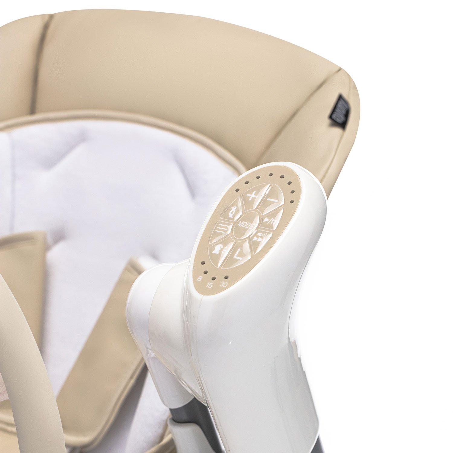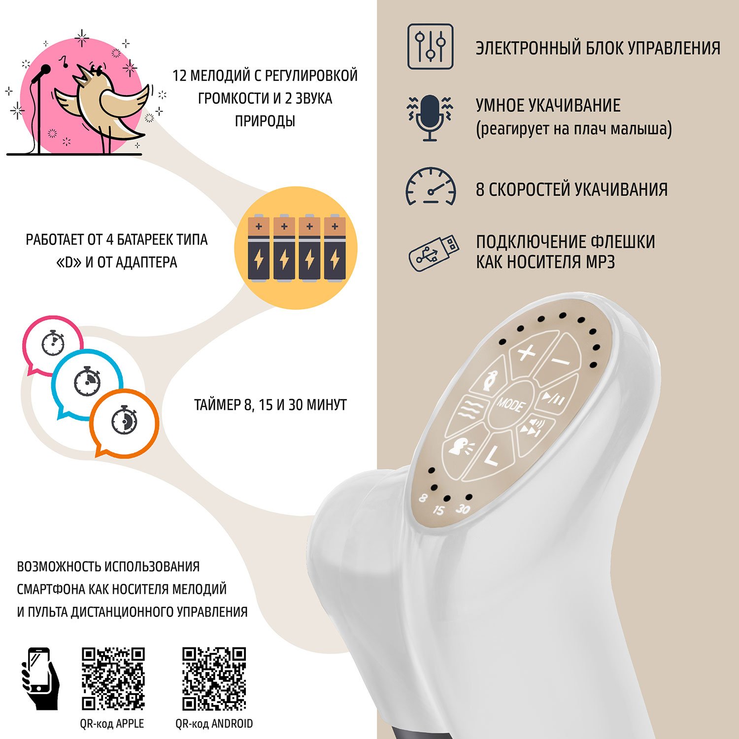 - Присутствует датчик «Умного укачивания» — электронный механизм реагирует на плач ребенка и запускает качание.