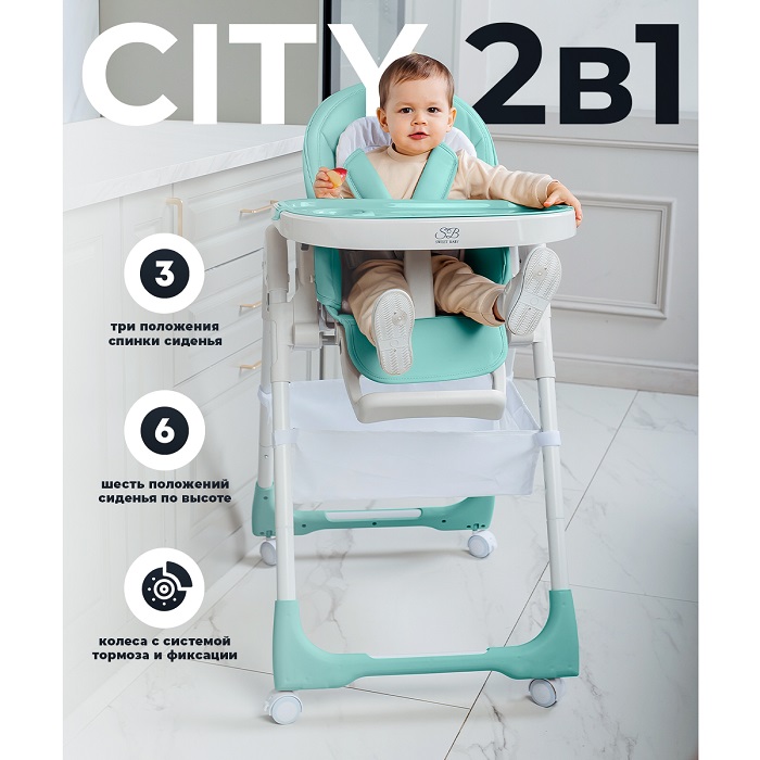 Стульчик для кормления Sweet Baby City (Свит беби сити) - это аккуратный, компактный стульчик для кормления и отдыха ребенка. Благодаря большому наклону спинки стульчик можно использовать как шезлонг для ребенка от 4 месяцев. Стул выполнен из качественных материалов, которые гарантируют безопасность и удобство во время пользования данной моделью. Форма спинки и высота подножки обеспечиваем анатомически правильную поддержку спины малыша. Обивка стульчика выполнена из качественной эко кожи, за ней легко и просто ухаживать, а стульчик всегда будет чистым. Дополнительный матрасик сделает нахождение для маленького ребенка еще более комфортным. Надежные 5-ти точечные ремни безопасности регулируются по высоте и снимаются для стирки при необходимости. В комплекте со стульчиком идет большая столешница со съемным подносом. На таком столике, будет удобно не только кушать, но и играть, рисовать или лепить. Под сиденьем стульчика расположена вместительная корзина для игрушек или вещей. Поворотные колёса с блокировкой. Стульчик очень мобильный за счет колес с фиксаторами.