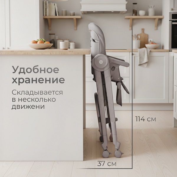 Для удобства перемещения по кухне и не только, стульчик оснащен колесами со стопорами. Для уборки, хранения, транспортировки, стульчик удобно и компактно складывается. В сложенном виде не занимает много места.