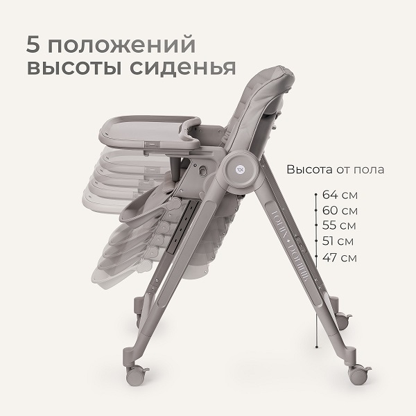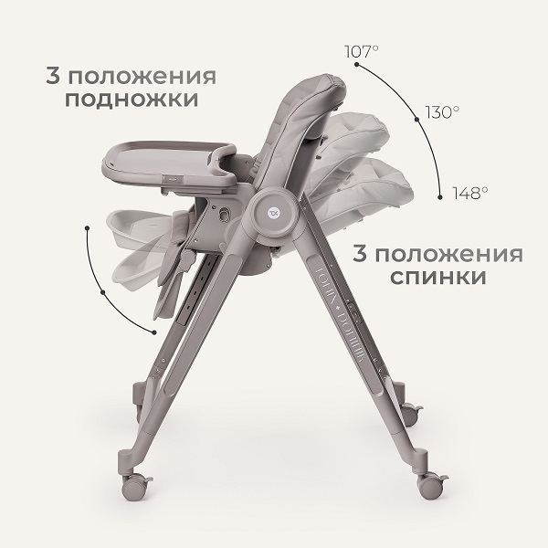 По мере роста ребенка стульчик превращается в ежедневный предмет не только для кормления, но и для игр, например, пока мама готовит еду или перекусывает, для занятий и творчества. Простые и удобные настройки позволят в считанные секунды превратить стульчик в удобное место для кормления или позволит малышу комфортно отдохнуть после еды. Чехольчик стульчика выполнен из эко кожи, что позволит влажной тряпочкой или салфеткой убрать остатки еды после кормления. Если нужна более качественная чистка обивки, то все снимается для стирки в стиральной машине в бережном режиме. Для совсем маленьких предусмотрен дополнительный текстильный вкладыш, который создаст более комфортное положение ребенка в стульчике.