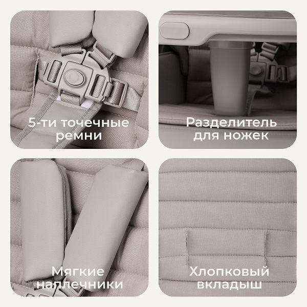 - разделитель для ножек, мягкие наплечники, 5точечные ремни безопасности