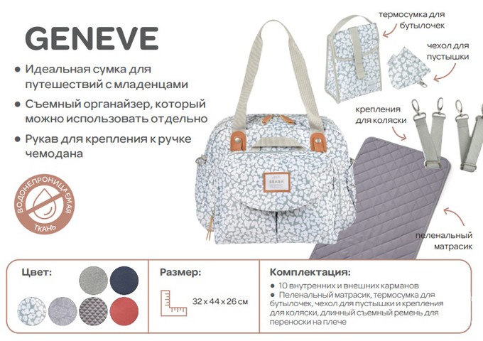 - Стильный дизайн и расцветки мультифункциональной вместительной материнской сумки Beaba Geneva станут отличным аксессуаром для любой мамочки!