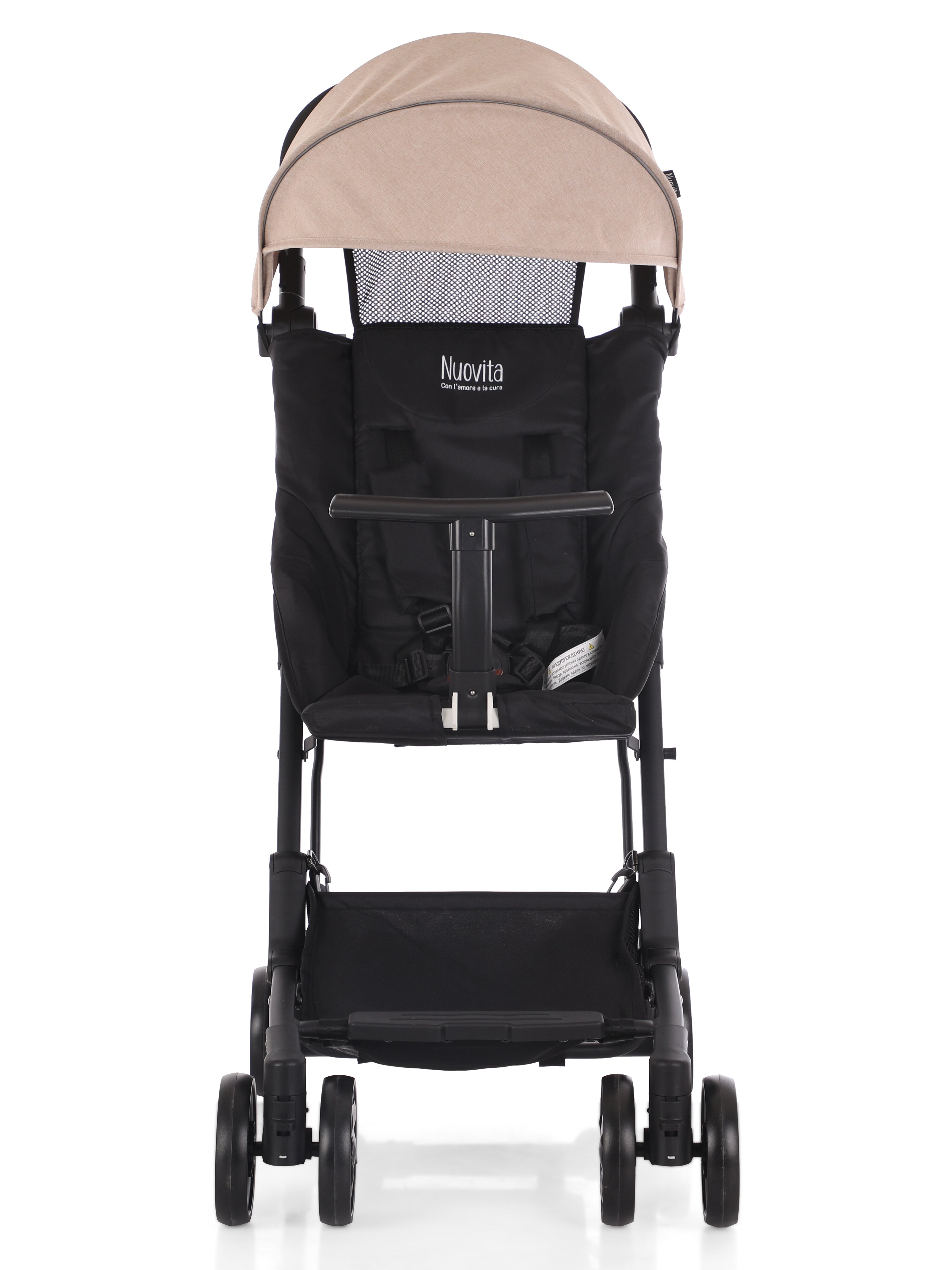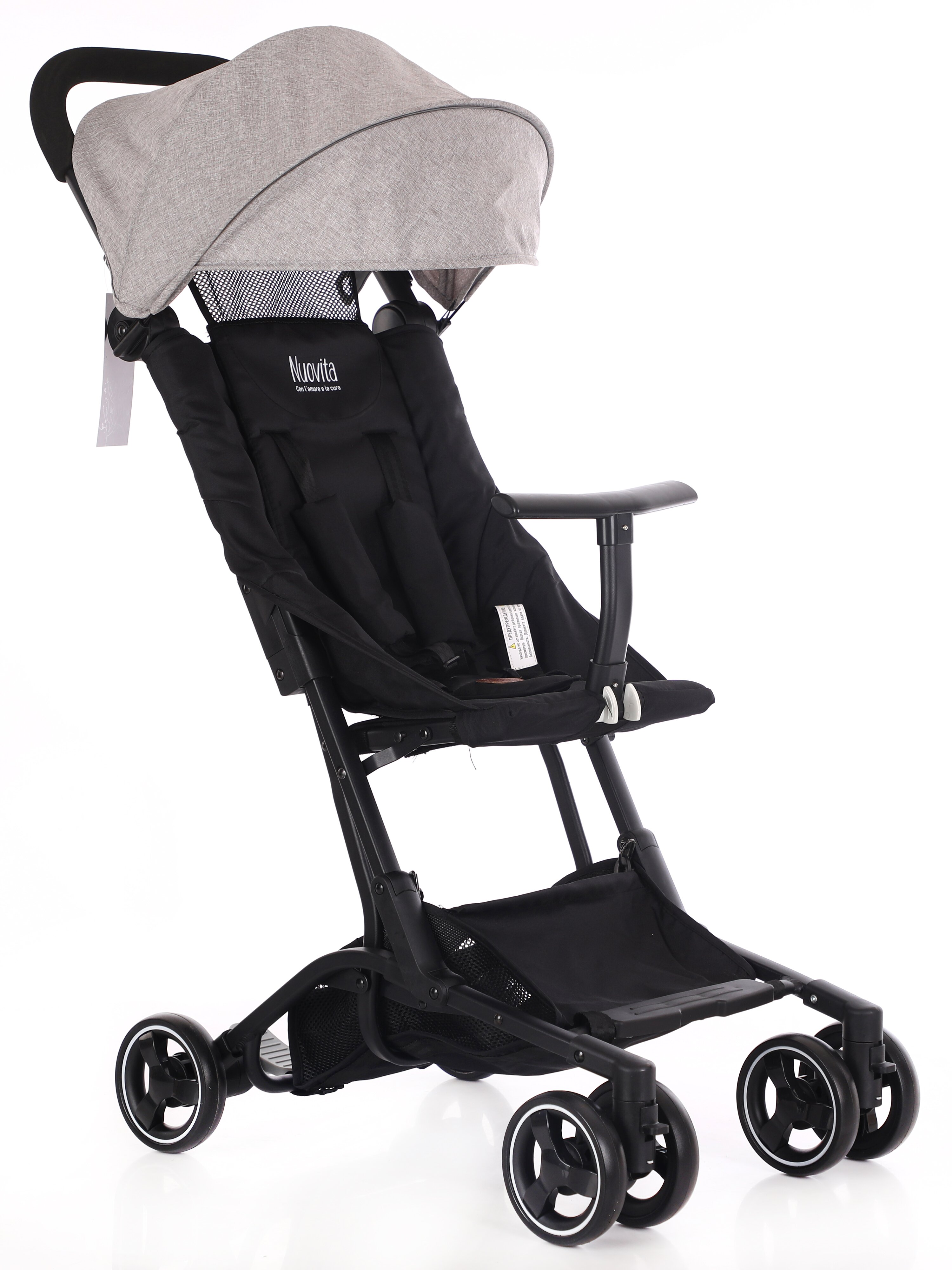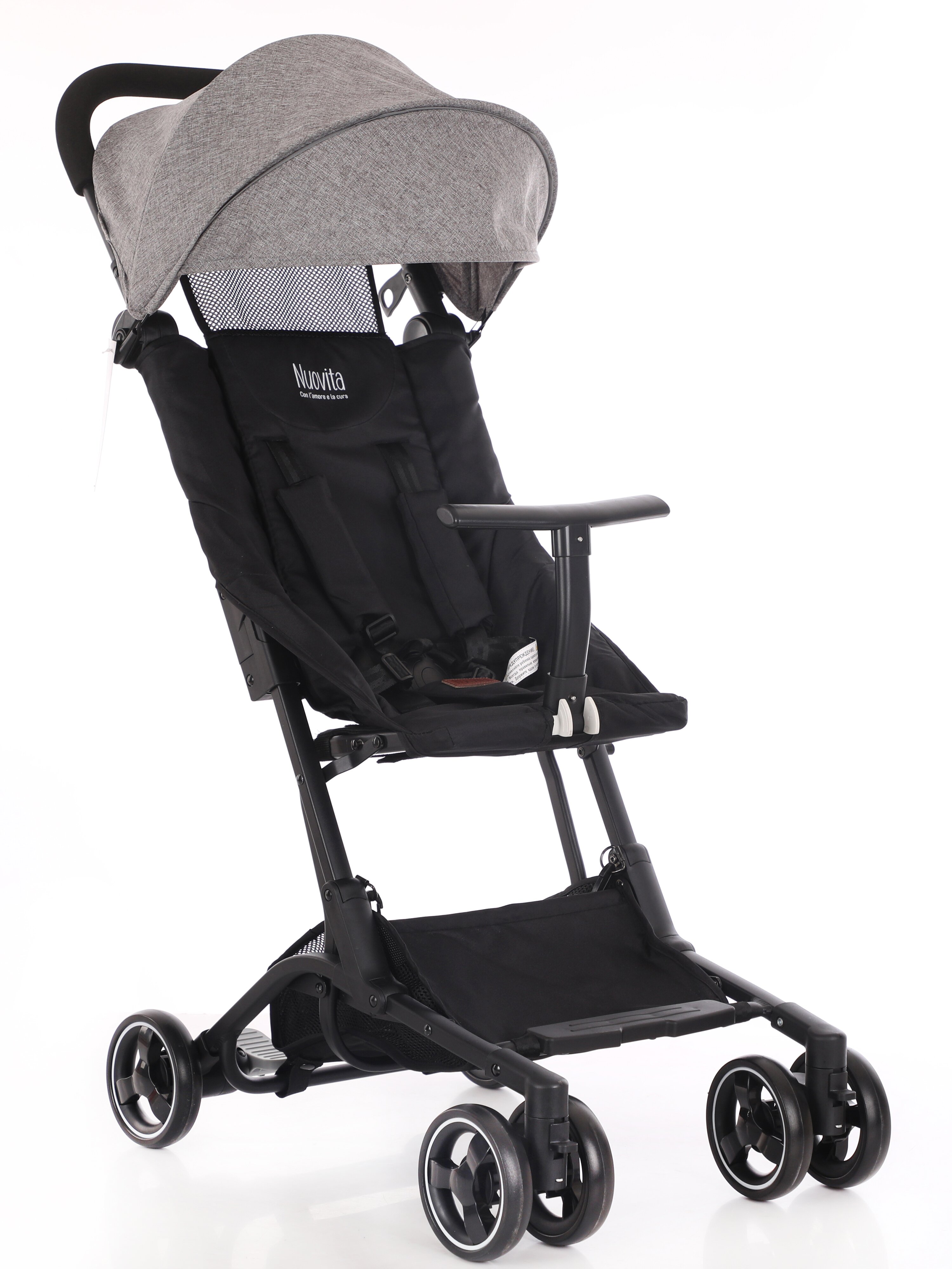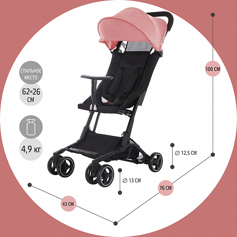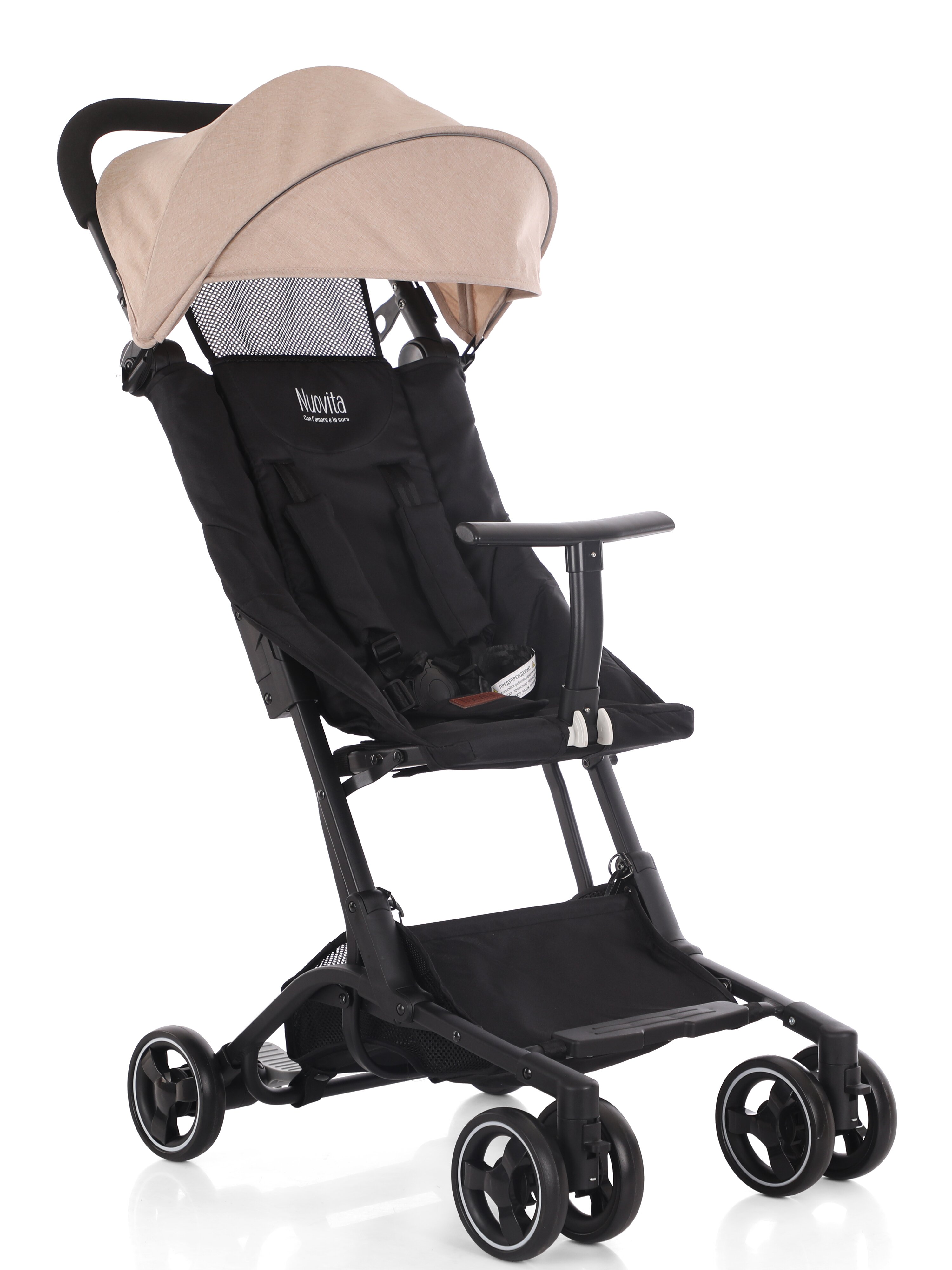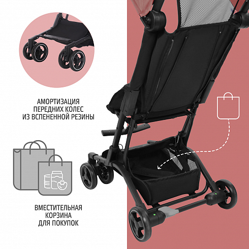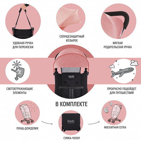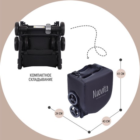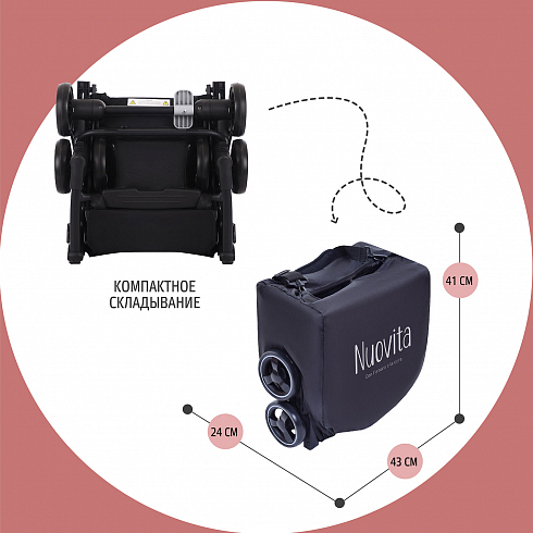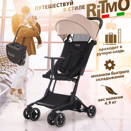 Коляска Nuovita Ritmo (нуовита ритмо) - супер компактная коляска для ребенка от 6 месяцев с весом чуть меньше 5 кг. Она настолько компактно складывается, что даже подойдет в ручную кладь для самолета. Ширина колесной базы, как размер стандартной клавиатуры, 43 см. Передние колеса сдвоенные и выполнены из вспененной резины. Она управляется легко, весит мало и с ней очень легко на прогулке. Прекрасный вариант для домой, где нет лифта, для торговых центров или поездок.