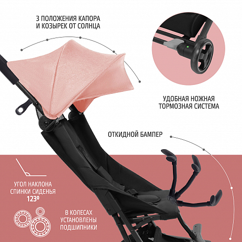 Для ребенка предусмотрен наклон спинки до 123 градусов, интересная ручка -поручень, которую легко откинуть для посадки ребенка. От солнышка есть удобный капюшон. В данной модели предусмотрена подножка на раме коляски.