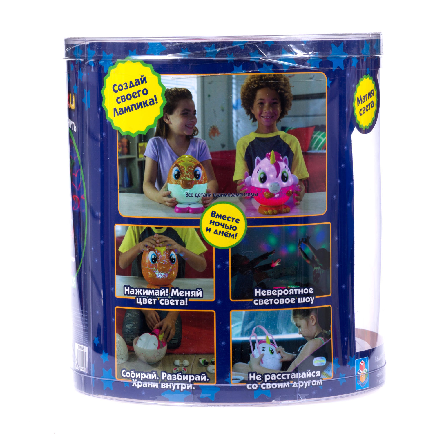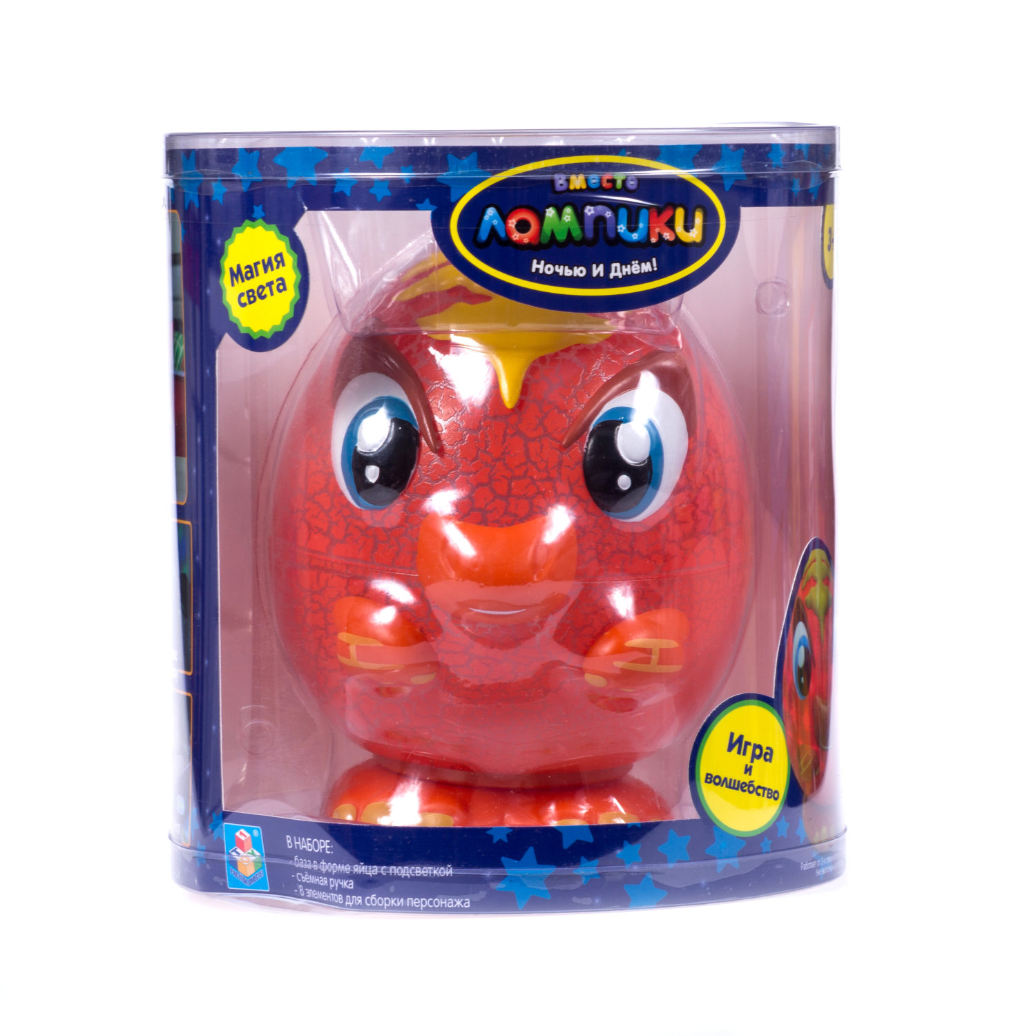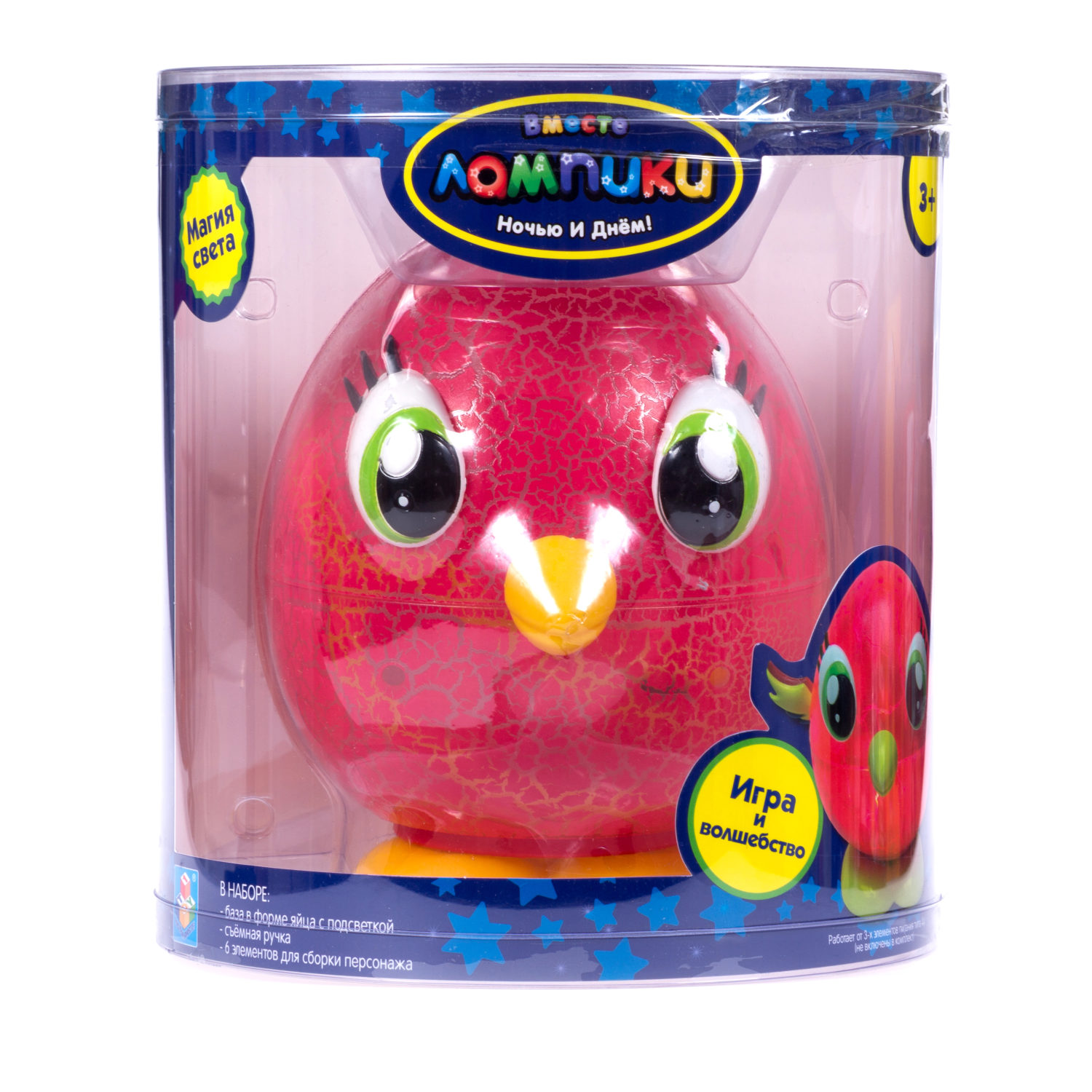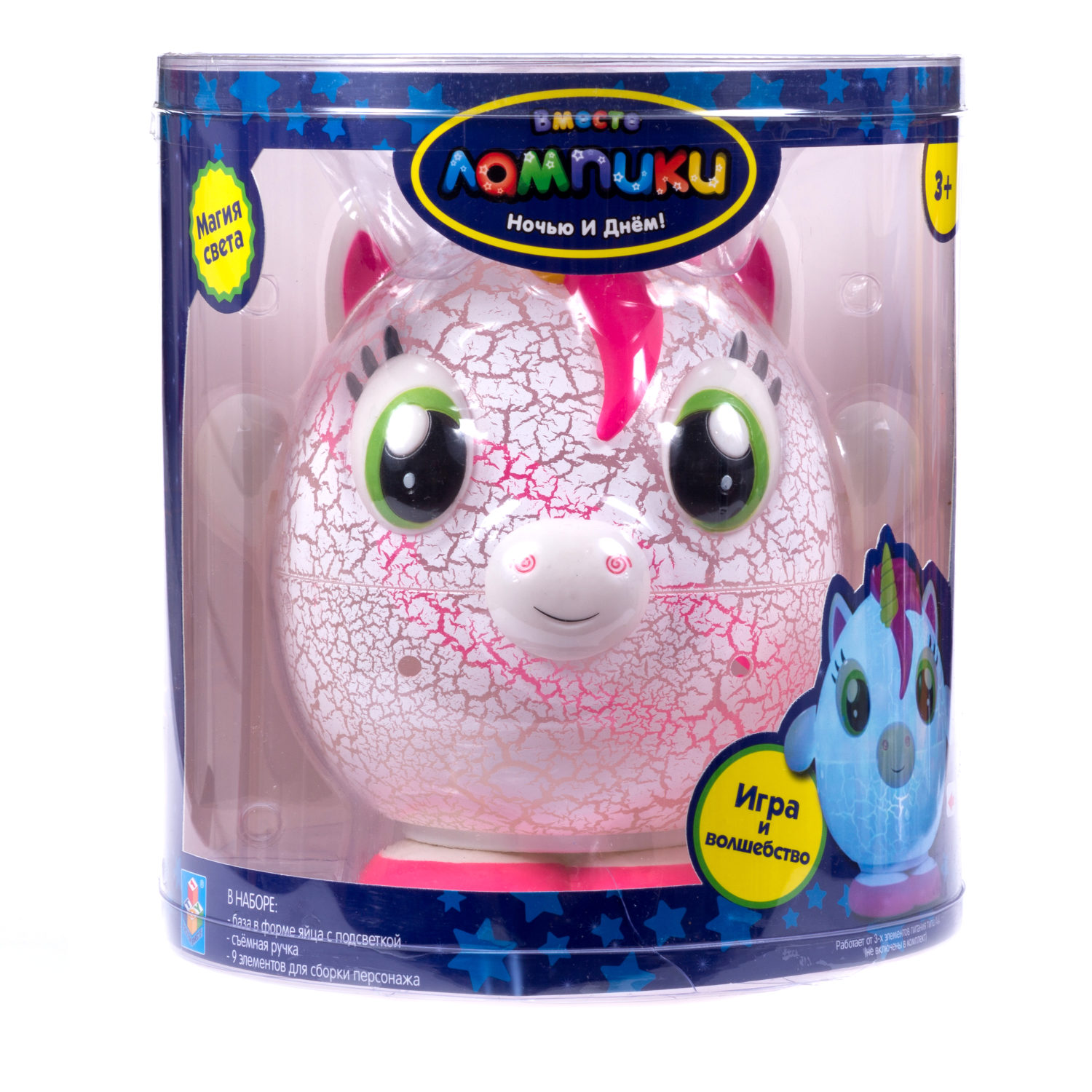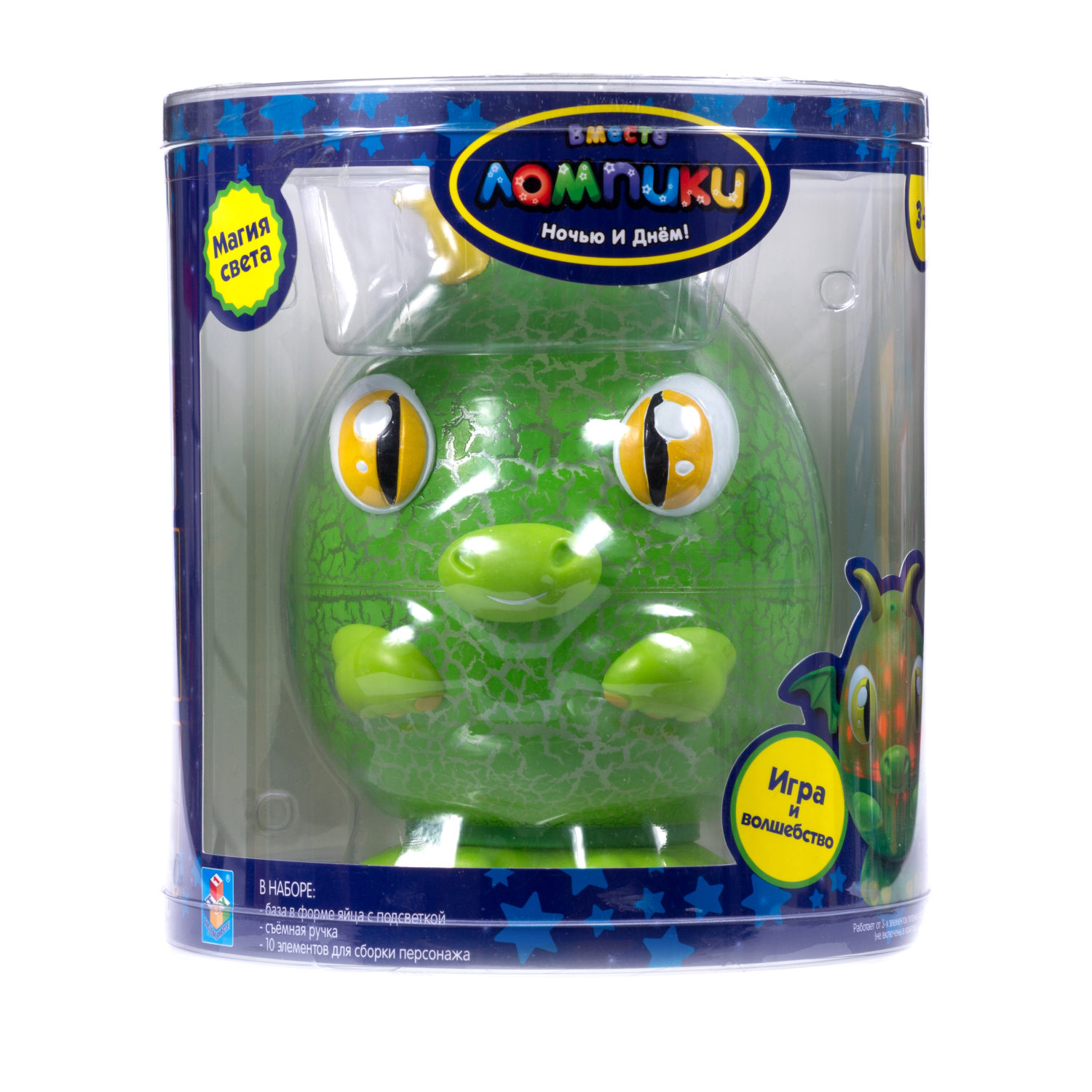 Светильник-игрушка 1TOY Лампики в банке - игрушка, которая станет отличным другом для ребёнка. Яркий персонаж принесёт немного магии и волшебства в Ваш дом. Многофункциональный светильник представляет собой базу в форме яйца с подсветкой. Внутри нее хранятся элементы для сборки персонажа и съёмная ручка, благодаря которой Лампика везде можно брать собой. Это не только ночник, который реагирует на свет и светится разными цветами, но ещё и проектор, ведь, если открыть крышку, то огоньки проецируются на стены и потолок, создавая невероятную атмосферу вокруг. Лампик засыпает вместе с ребёнком (автоматическое выключение в состоянии покоя через 12 минут). Работает от 3-х батареек типа АА 1,5 В (не включены в комплект).