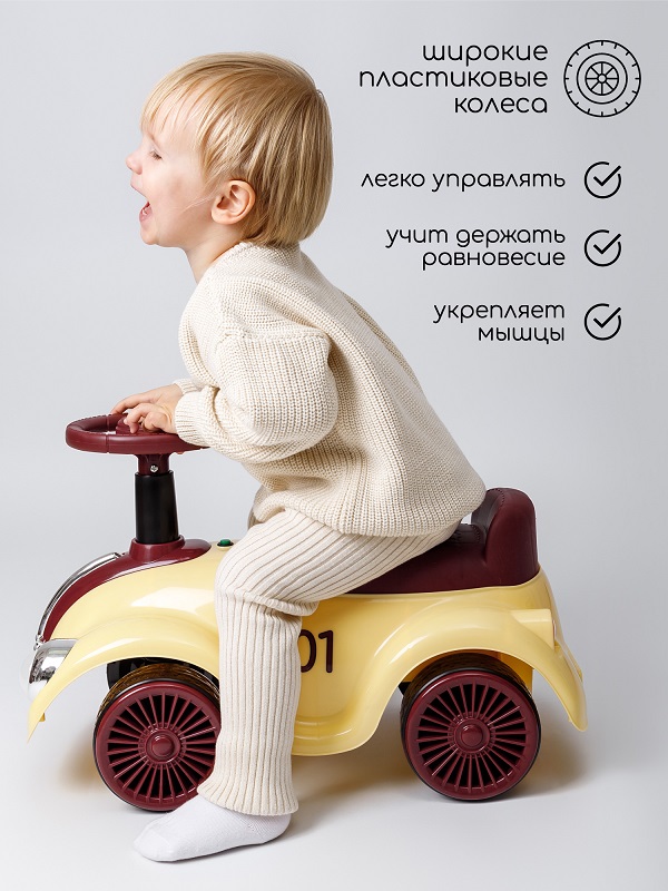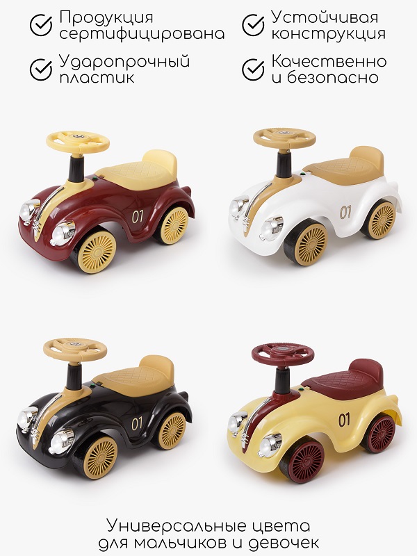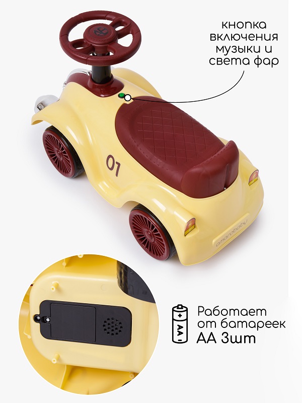 Толокар Amarobaby Retro (амаробеби ретро) - стильная и безопасная машинка - каталка для вашего ребенка. Дизайн толокара выполнен в стиле гоночного ретро автомобиля и прекрасно подойдет как мальчику, так и девочке. Машинка имеет легкий вес, всего 2кг, что позволит ребенку легко справляться со своим транспортом самостоятельно. Машинка оснащена кнопкой с музыкой и включением фар, что еще больше доставить удовольствия ребенку и сделает катание еще более интересным.