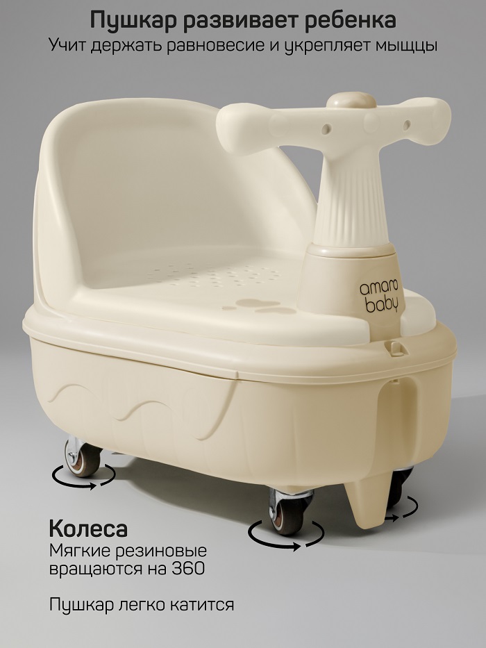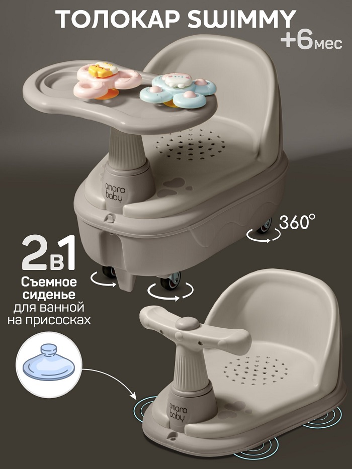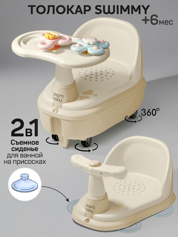 Толокар AmaroBaby Swimmy 2в1 (амаробеби свимми) - уникальная модель, которая включает в себя не только удобный и безопасный толокар-машинку, но и функцию детского сиденья для купания! Играйте и катайтесь, а когда придет время купаться, просто снимите верхнюю часть, и толокар превратится в удобное сиденье для купания, а ребенку не придется растоваться со своей машинкой. Сиденье для купания малыша подходит для использования в детских ванночках, в обычных ваннах и душевых кабинах. Стульчик для купания изготовлен из высококачественных материалов, что делает его прочным и устойчивым.