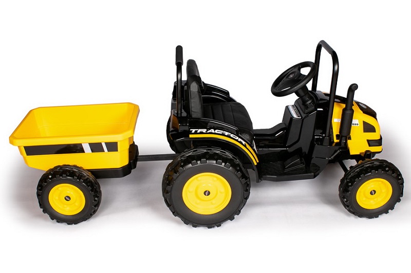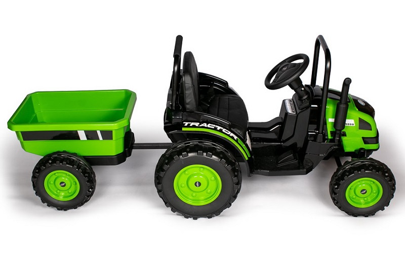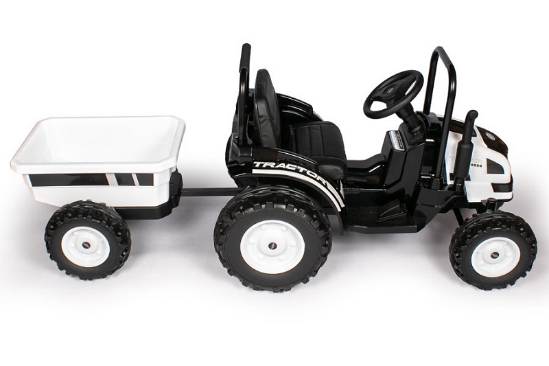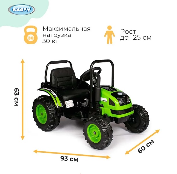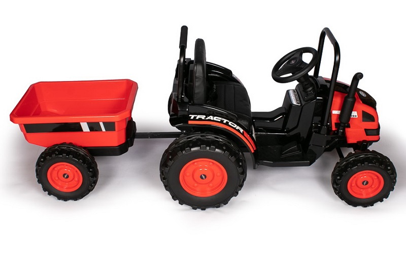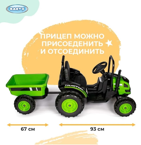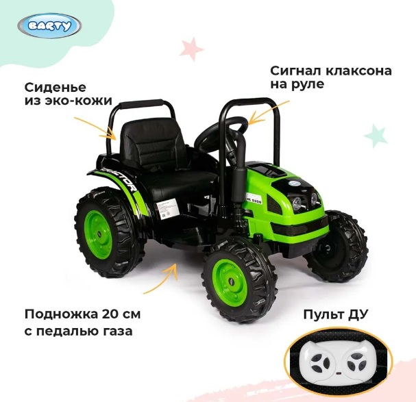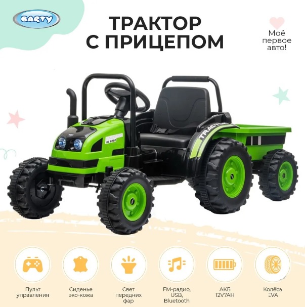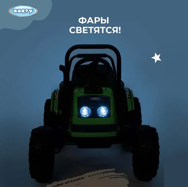 ТРАКТОР С ПРИЦЕПОМ BARTY TR001 (Барти тр001) - Яркий и многофункциональный аккумуляторный трактор обязательно понравится Вашему ребенку, ведь благодаря наличию съемного прицепа на нем можно не только кататься, но и придумывать различные игры. Два мотора суммарной мощностью 70 Ватт и большие резиновые колеса с глубоким рисунком протектора позволят гонять по любым дорогам. За комфорт маленького водителя отвечает удобное кожаное кресло с ремнем безопасности. Катание станет еще более увлекательным с музыкальным сопровождением: ребенок может слушать свою любимую музыку через медиапанель с USB входом и встроенные динамики. Для хорошего обзора на вечерних прогулках электромобиль-трактор оборудован светодиодной подсеткой фар. Пульт ДУ в комплекте поможет начинающим водителям с управлением машинкой.