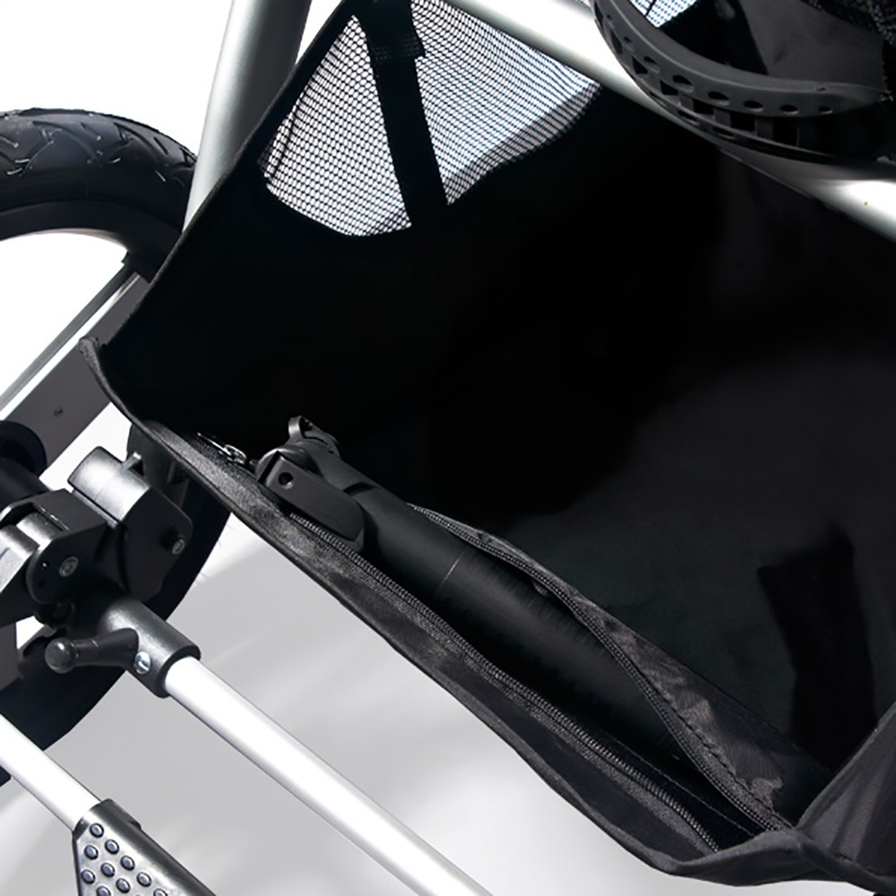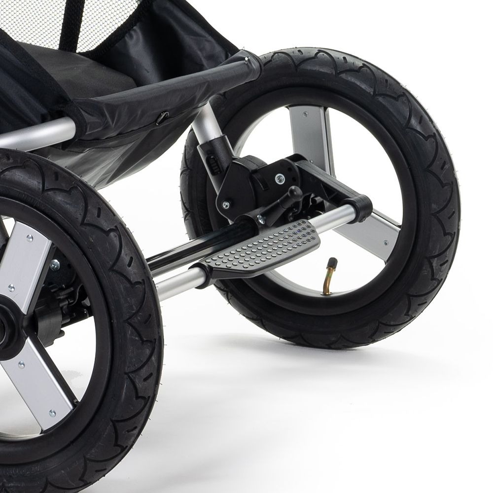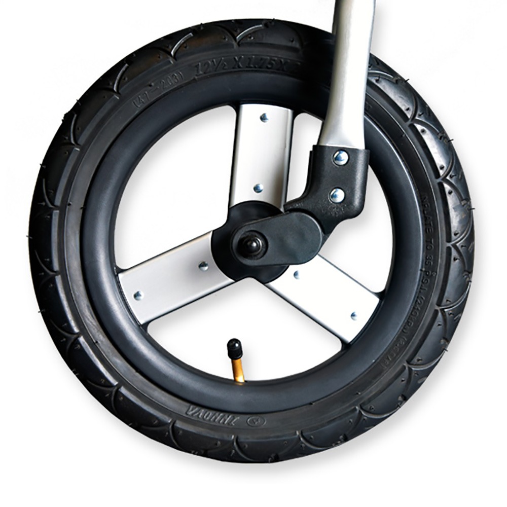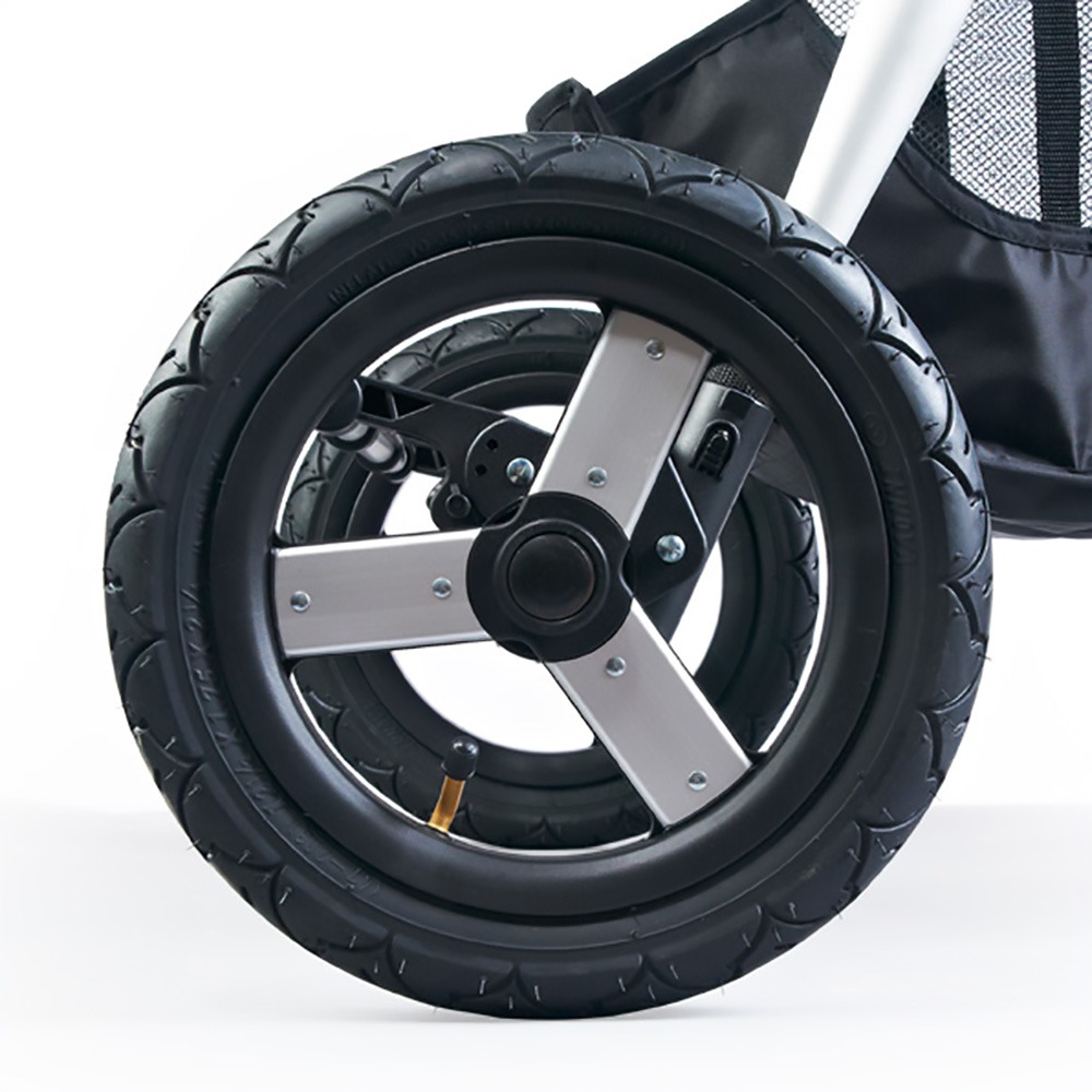 Надежная алюминиевая рама оснащена 3 большими надувными колесами. Надувные колеса прекрасно поглощают вибрацию, а в сочетании с амортизацией прекрасно смягчают ход и делают поездку мягкой и бесшумной. Для простоты обслуживания колес в комплекте с коляской идет специальный насос. Переднее колесо поворотное, оно дает невероятную маневренность коляске. Вы сможете легко объезжать любые препятствия на своем пути. Но если дорога неровная, колеса легко фиксируется в положение только прямо и коляска превращается в настоящий внедорожник.