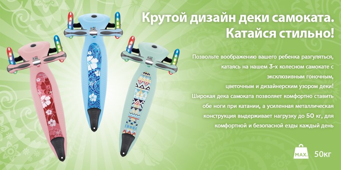 - Крутая модель 3-х колесного детского самоката с ярким и веселым принтом на деке с цветочным, гоночным и эксклюзивным дизайнерским узорами.