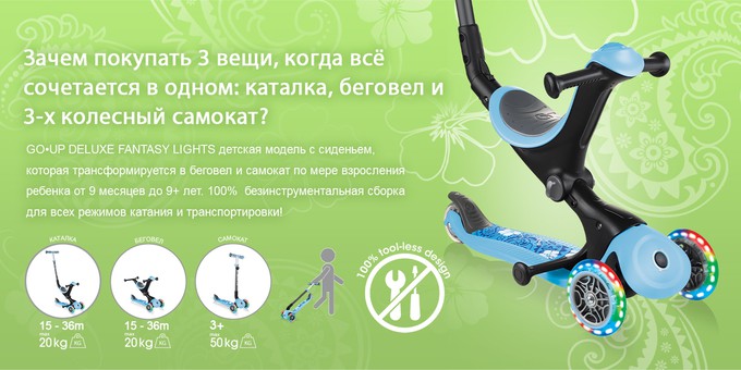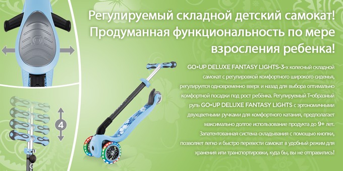 Трехколесный самокат Globber Go up Deluxe Fantasy Lights (Глоббер гоу ап делюкс фентези лайтс ) - яркий, функциональный, современный самокат 3 в 1 для ребенка с 1 годика до 9 лет. Самокат рассчитан на большой период времени, подстраиваясь под ребенка и делая прогулки интересными и увлекательными. Самокат оснащен регулируемым широким сидением и регулируемой ручкой управления, свето - музыкальным модулем, светящимися колесами и яркой стильной декой. Для удобства транспортировки самокат удобно складывается.