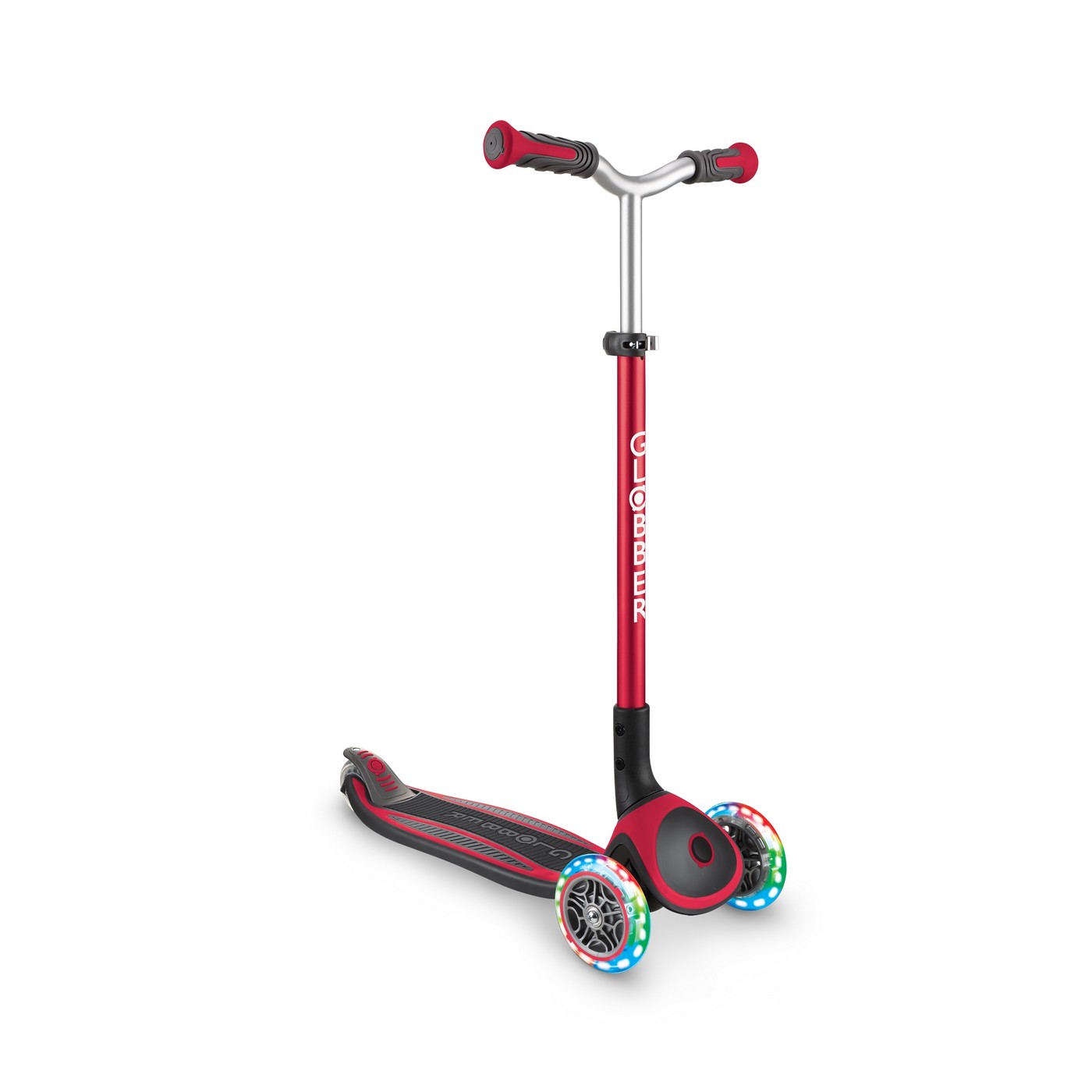 Трехколесный самокат Globber Master Lights (Глоббер мастер лайтс) - трехколесная модель самоката с усиленной экстра широкой декой с нескользящей прорезиненной поверхностью и широким диапазоном регулировки высоты руля, что позволяет использовать его с 4 до 14 лет. Складной механизм надежный и простой в использовании, руль самоката приставляется к платформе и Master Lights можно катить за собой. Надежный экстра широкий тормоз, Y-образный анодированный руль с тактильно мягкими эргономичными ручками с упорами, качественные подшипники и подсветка колёс делают самокат стильным, а главное надежным и долговечным!