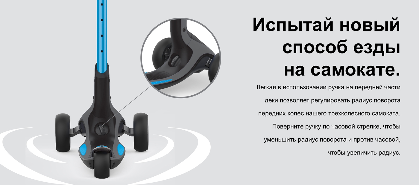 Этот необычный самокат оснащён запатентованной системой управления, позволяющей легко регулировать радиус поворота передних колёс. Теперь поездка на самокате будет приносить еще больше радости и веселья.