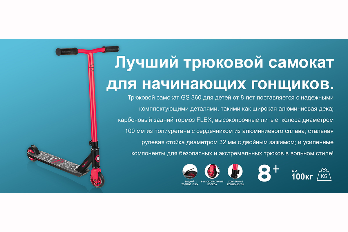 Трюковой самокат Globber GS 360° (глоббер гс 360) - надежный самокат для трюков и активного образа жизни. Самокат подойдет для обучения трюкам и катанию на рампе. Оборудованный декой с противоскользящим покрытием и удобным задним тормозом из композитного материала, самокат станет надежным спутником в трюковой езде. Модель оснащена литыми алюминиевыми колёсами с шестью спицами и промышленными подшипниками Abec 7 с алюминиевым сердечником для плавной езды с хорошим накатом. А удобный Т-образный руль с мягкими грипсами 125 мм будет способствовать быстрому обучению маневрам и прокрутам на все 360 градусов. Модель заточена под высокие нагрузки и просто ждет экстремальных испытаний.