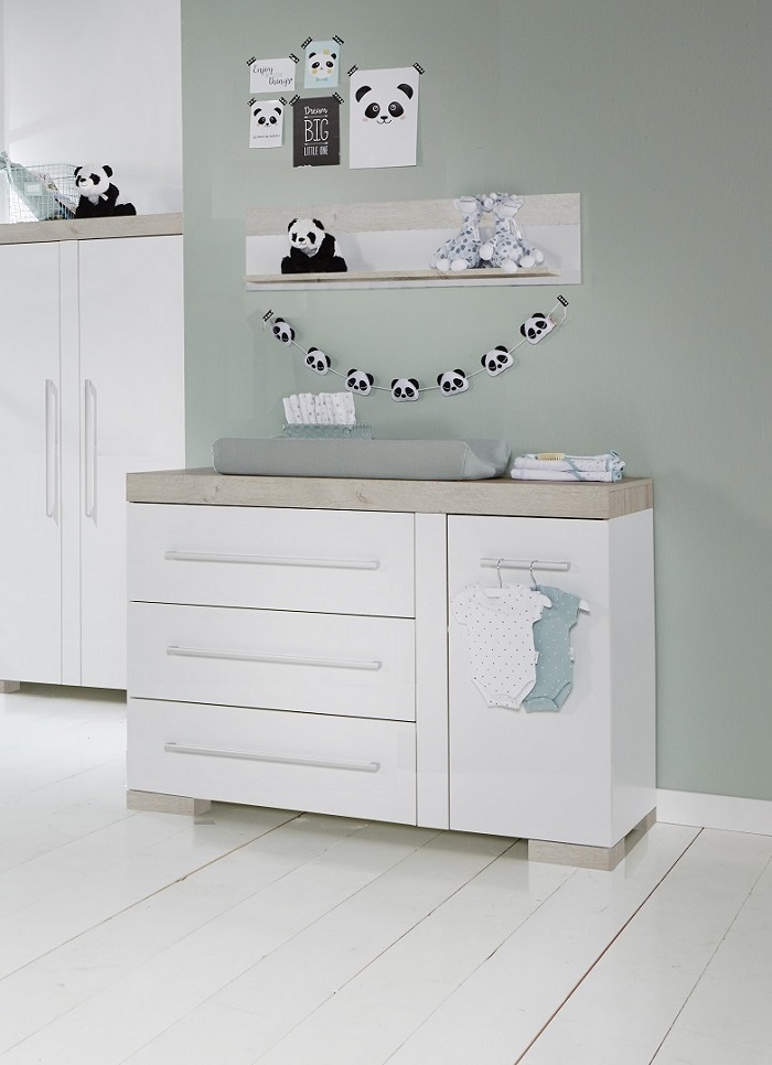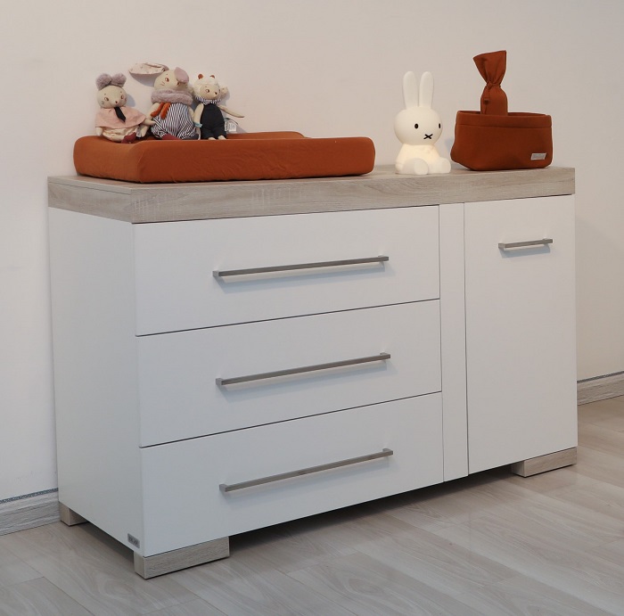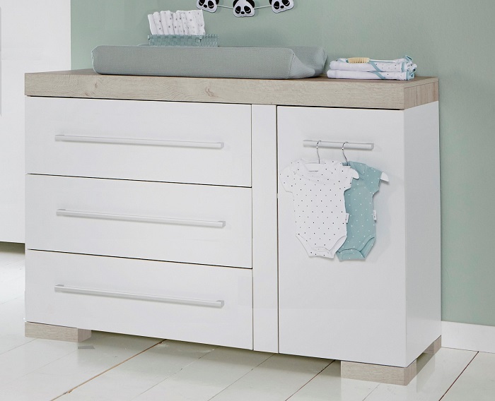 Съемная пеленальная поверхность поможет маме переодевать ребенка на удобной для нее высоте 95 см, проводить для малыша все необходимые гигиенические процедуры, воздушные ванны, массаж. Когда пеленальный столик станет не актуальным, он легко снимается, а бельевой комод станет частью интерьера.