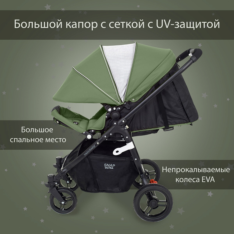 Коляска Valco Baby Snap 4 Ultra (валко бэби снап 4 ультра) – легкая коляска для ребенка с рождения с реверсивным сидением. Благодаря усиленной раме и большому просторному сидению, коляска выдерживает нагрузку до 22 кг и может использоваться до 4-5 лет. Коляска имеет удобную регулировку спинки по высоте, до почти горизонтального положения (175 градусов), регулируемую подножку, благодаря чему образуется очень комфортное спальное место для сна ребенка на улице. Большой капюшон до бампера со специальной секцией для проветривания закрывает ребенка от любой непогоды или яркого солнца. Качественная обивка не боится влаги, ветра и Уф лучей. Австралийское качество гарантирует безопасность и комфорт ребенка в коляске.