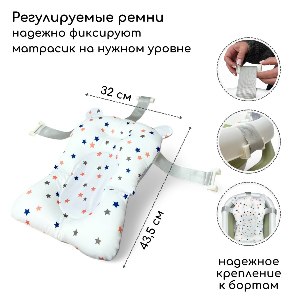 Чтобы обезопасить младенца во время купания в комплекте с ванночкой идет матрасик-гамак, который не тонет в воде и регулируется по глубине погружения. Матрасик-гамак не только помогает поддерживать ребенка на плаву, но и обеспечивает правильное и безопасное положение тела и головы над водой во время купания.