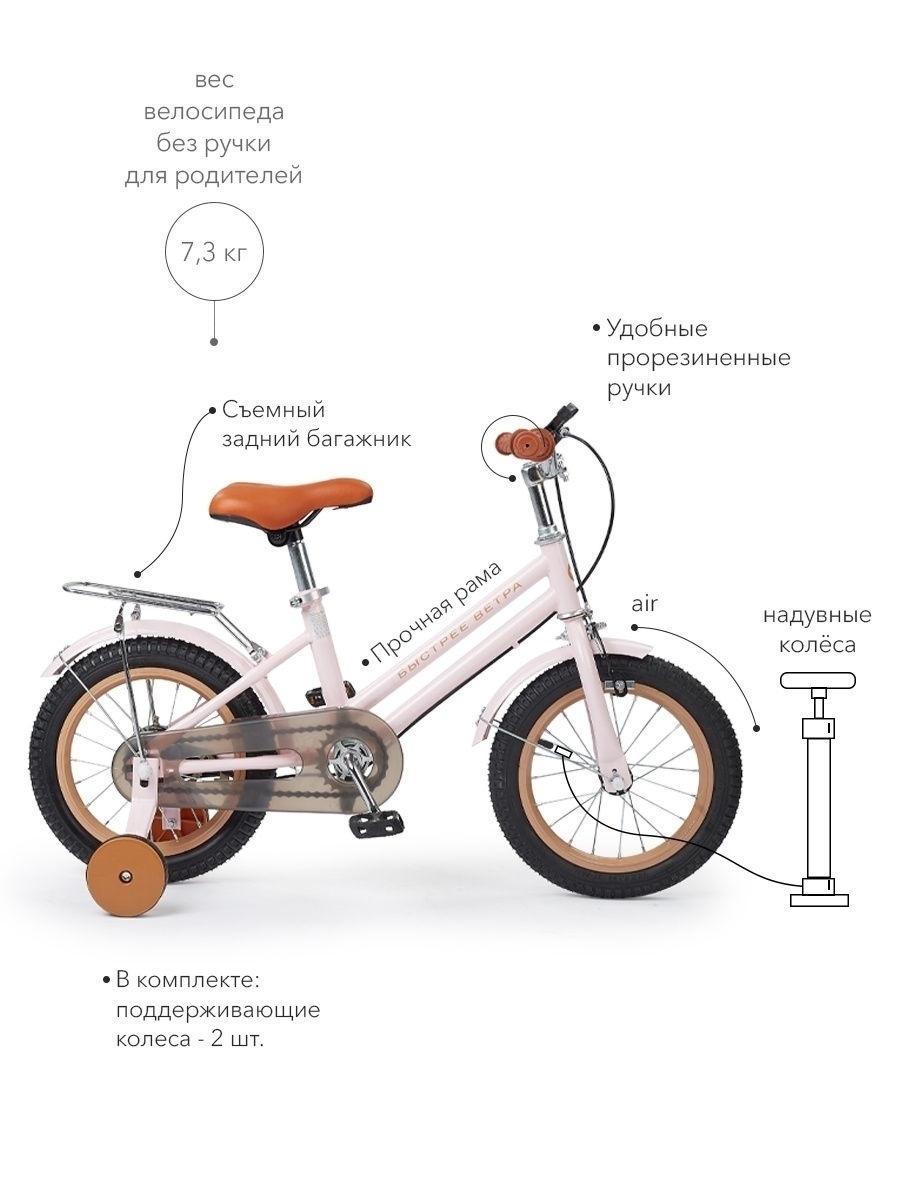 В комплекте: поддерживающие колеса - 2 шт., ручка для родителей - 1 шт, багажник