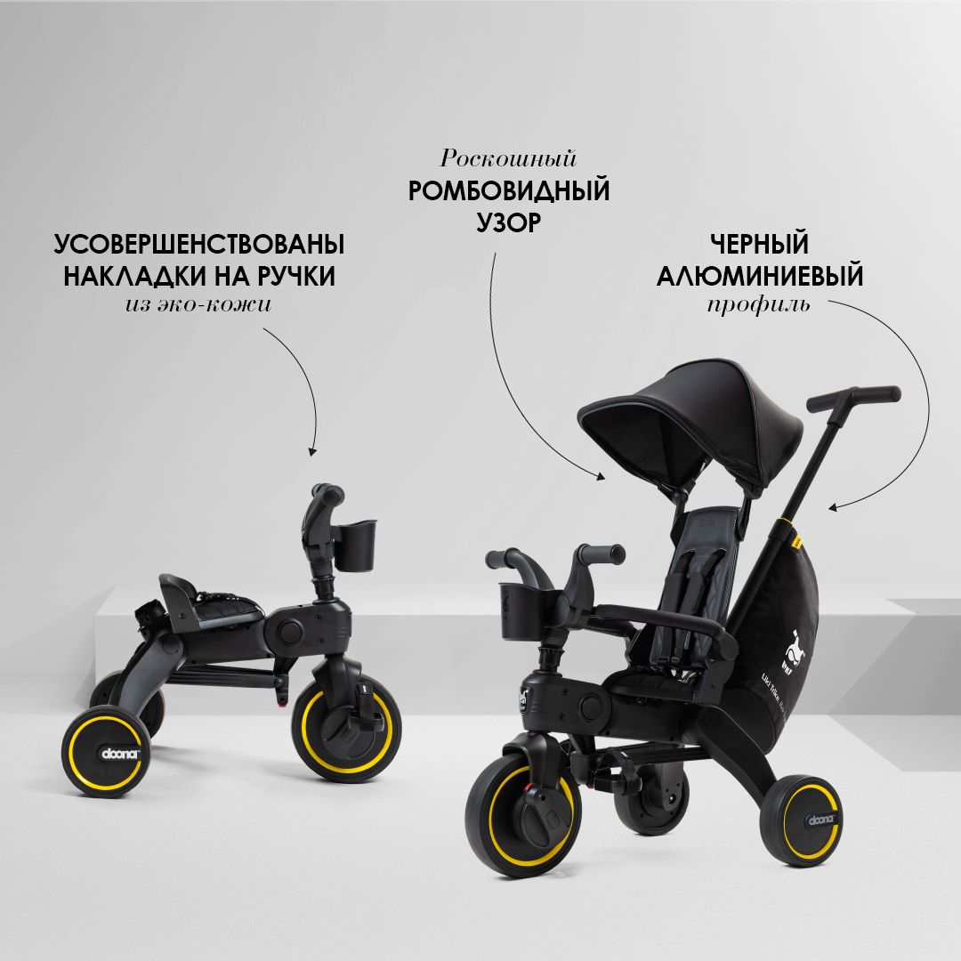 Велосипед Doona Liki Trike Limited Edition Midnight (Дуна лики трайк) - поражает своим дерзким и решительным дизайном в полностью черном исполнении со сложными элементами. Складной велосипед Liki Trike Limited Edition комплектуется сумкой для путешествий, подстаканником, премиальной сумкой для хранения. Накладки на ручки, спинка и сиденье - из эко-кожи с ромбовидной прошивкой. Черная рама из анодированного алюминия. Версия Midnight предлагает эксклюзивный дизайн для современных родителей, которые ценят стильные и функциональные решения.