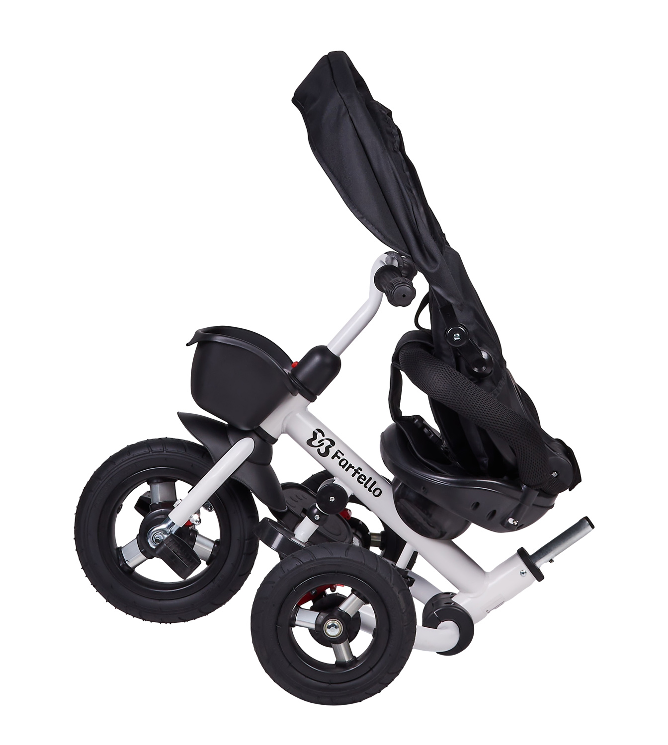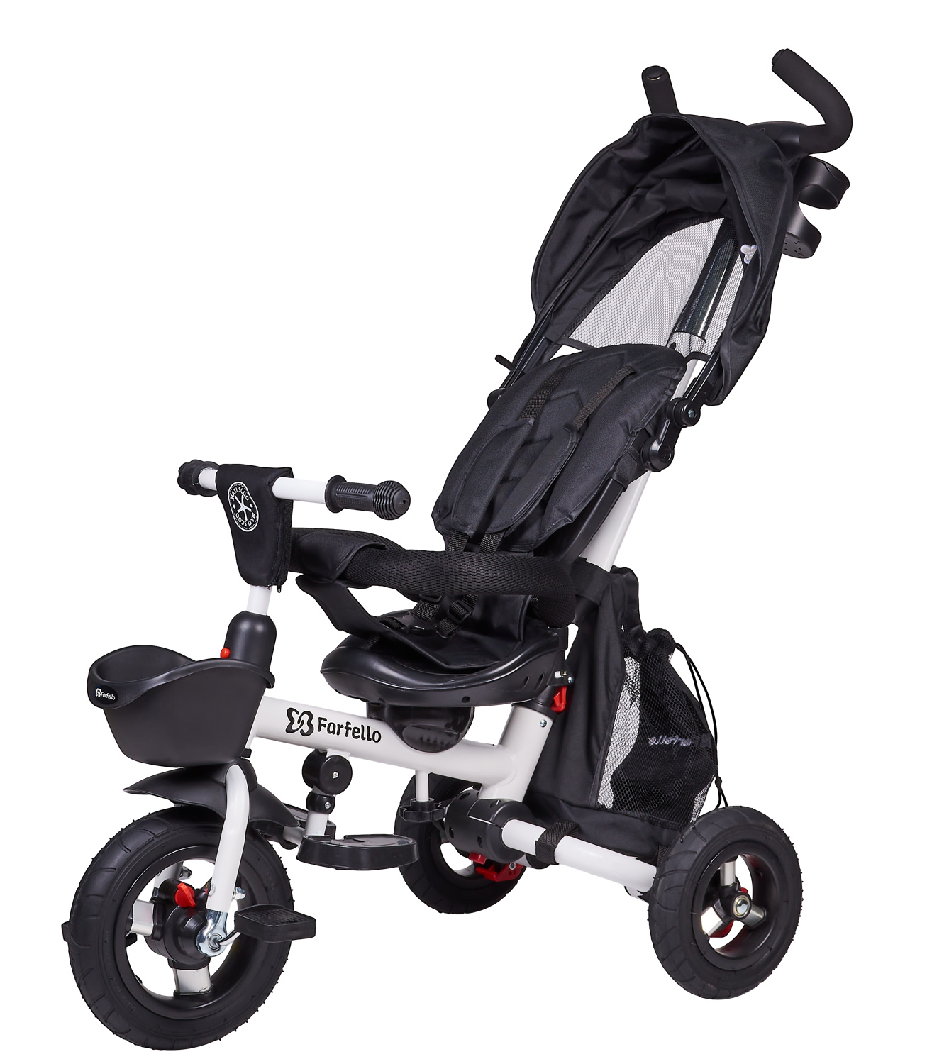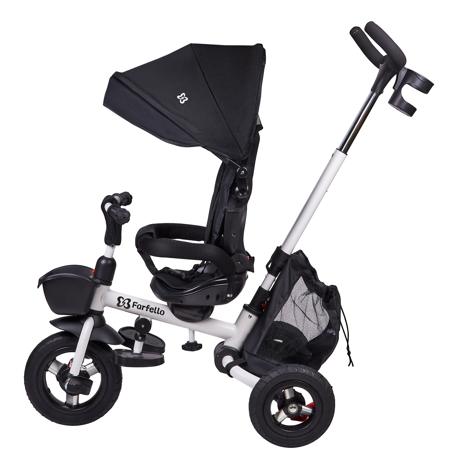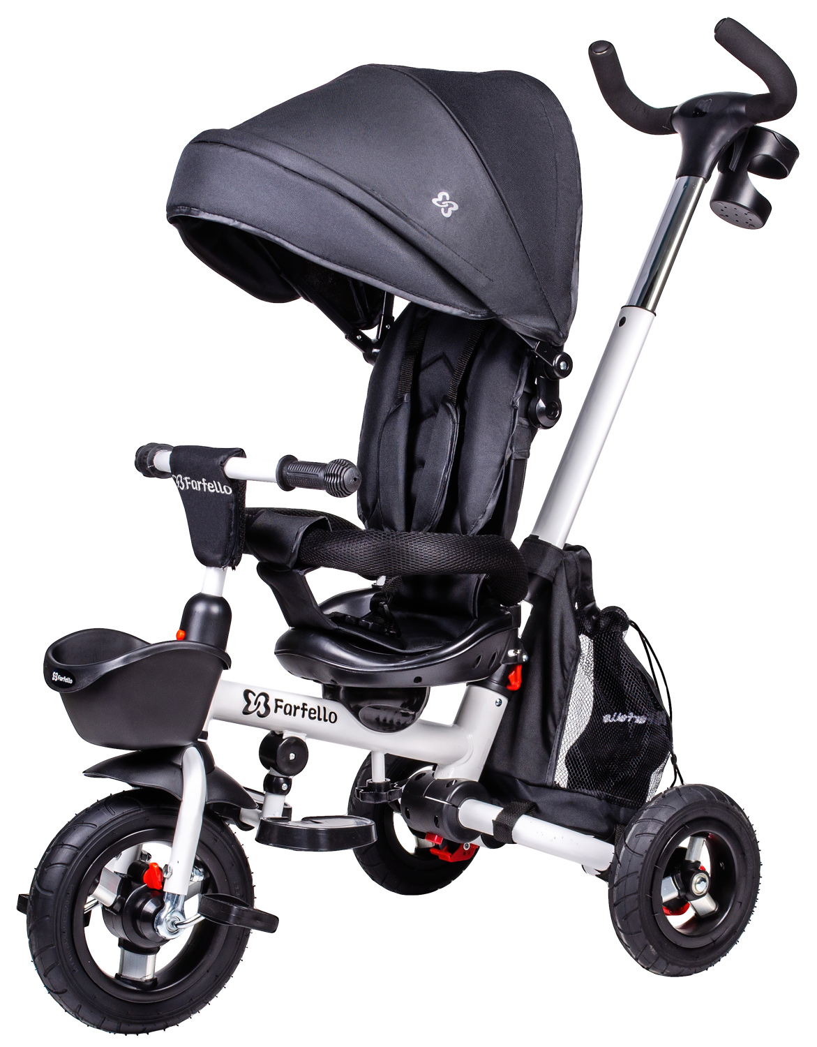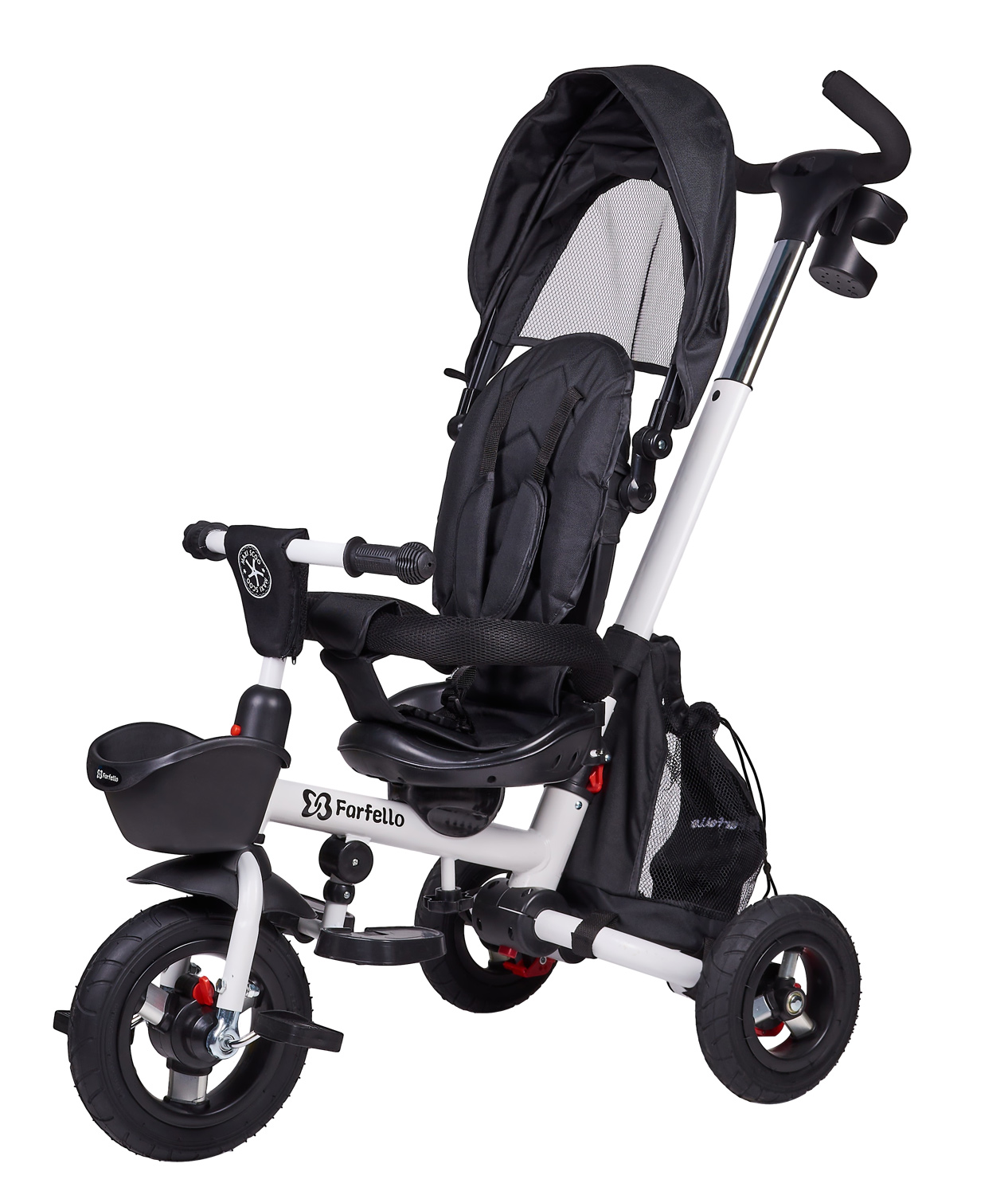 Велосипед Farfello S-01 (Фарфелло) - детский складной велосипед для прогулок с ребенком от 10 месяцев. Farfello S-01 это почти коляска для летних прогулок по городу: наклон спинки, капюшон для защиты ребенка от непогоды или яркого солнца, мягкое сидение, 5-ти точечные ремни безопасности с защитным бампером. Велосипедом может управлять сам ребенок, или родители с помощью удобной регулируемой ручки. Для игрушек предусмотрена небольшая корзинка на руле велосипеда и сумка-рюкзак. Для поездок на машине велосипед удобно складывается.