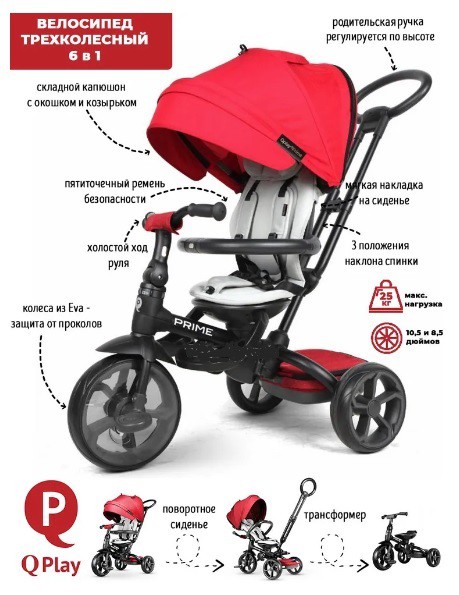Велосипед Qplay Prime (кьюплей прайм) - детский трехколесный велосипед с поворотным сидением для ребенка от 1 года до 5 лет. Этот велосипед легко заменит коляску в летний период времени. Этот велосипед такой же комфортный, как коляска, с мягким сидением, ремнями безопасности, бампером и удобной подножкой для маленьких ножек. Сидение поворачивается к родителям или к окружающему миру. Прекрасное положение для отдыха!