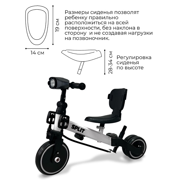 - Регулируемое по высоте сиденье — растет вместе с ребенком;