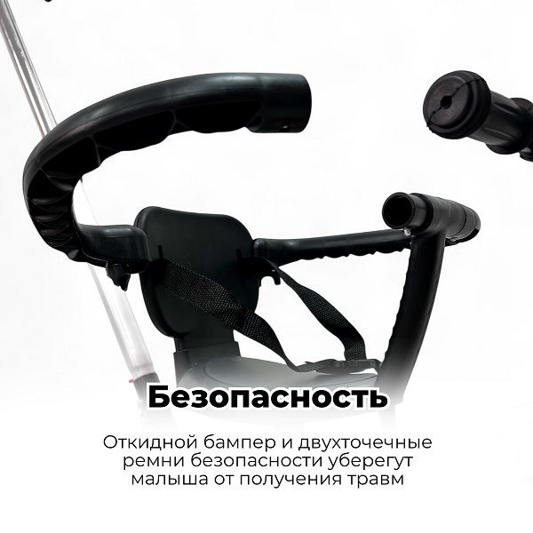 - Откидной бампер и двухточечные ремни безопасности — для надежной фиксации малыша;