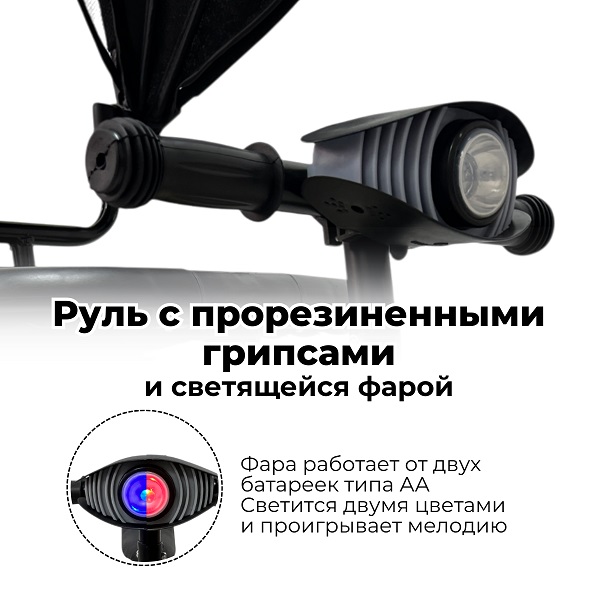 - Руль с прорезиненными ручками и встроенной светящейся музыкальной фарой — яркий и интересный элемент для ребенка.