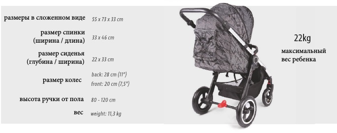 - Вес коляски: 10,8 кг