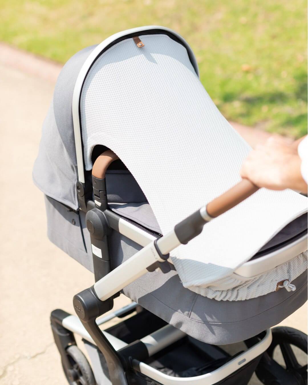 • С одной стороны крепится к капу на молнии (вместо козырька). С другой одевается на ручку коляски или на раму.