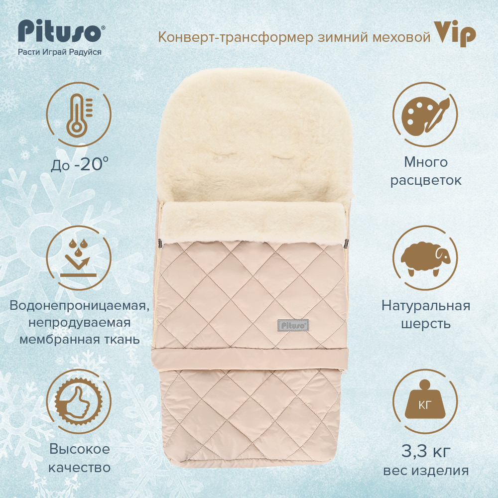 Зимний конверт трансформер Pituso Vip (Питусо вип) - теплый, зимний конверт для ребенка с рождения до примерно 2-3 лет, рассчитанный на температурный режим до -20 градусов. Конверт трансформер и имеет 2 длины: 75 и 100 см. Конверт 75 см подойдет в коляску-люльку. Конверт 100 см отлично подойдет для прогулочной коляски. Верхняя часть конверта выполнена из плотной непродуваемой мембранной ткани. Внутри конверта утеплитель из шерсти и синтепона.