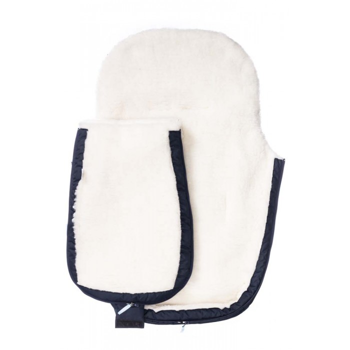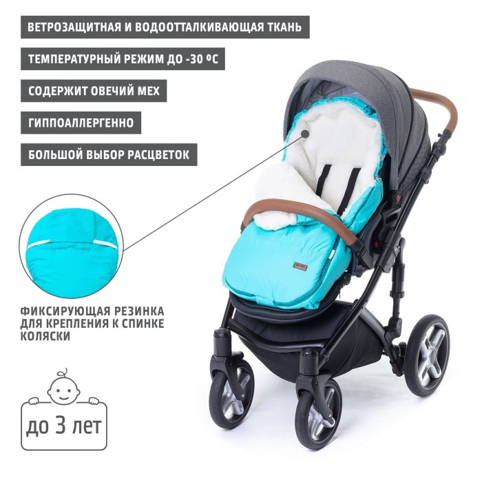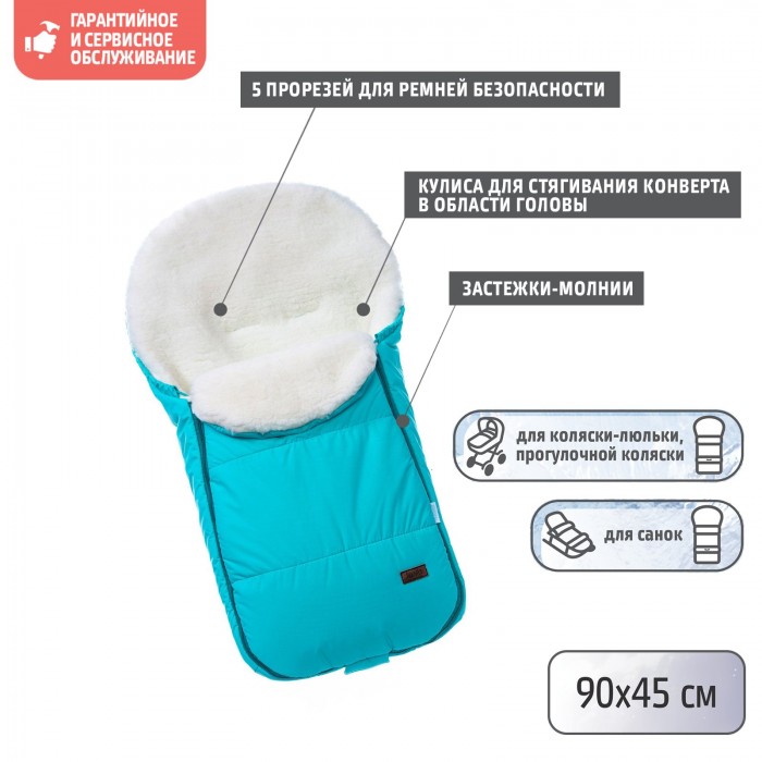 - Основа конверта — смесовая овечья шерсть, представляющая собой сочетание натуральной овчины и текстильного материала, который значительно уменьшает вес изделия (конверт весит 0,7 кг)