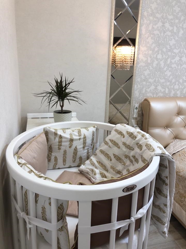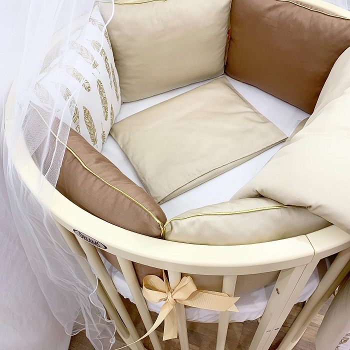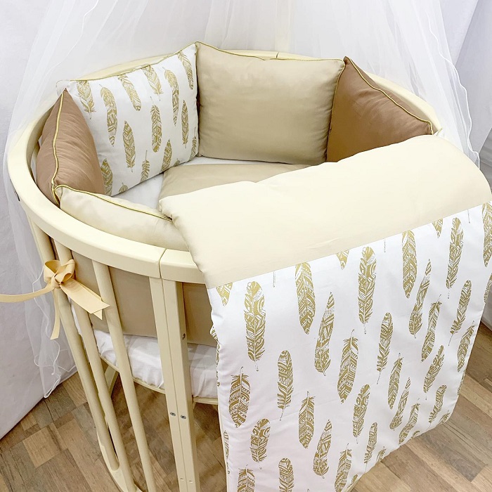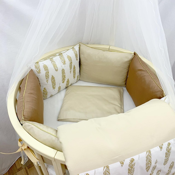 Комплект в кроватку Dreamtex Золотые перья (дримстех) - красивый комплект в круглую/овальную или классическую кровать 120х60 см. Комплект выполнен из сатина с нежным рисунком, в универсальной расцветке, которая отлично подойдет для мальчика или девочки. Все чехлы легко снимаются для стирки, что обеспечит легкий уход за бортиками. Так же в комплект входит небольшая подушечка для новорожденного, стеганное одеялко и 2 простыни для круг и овала.
